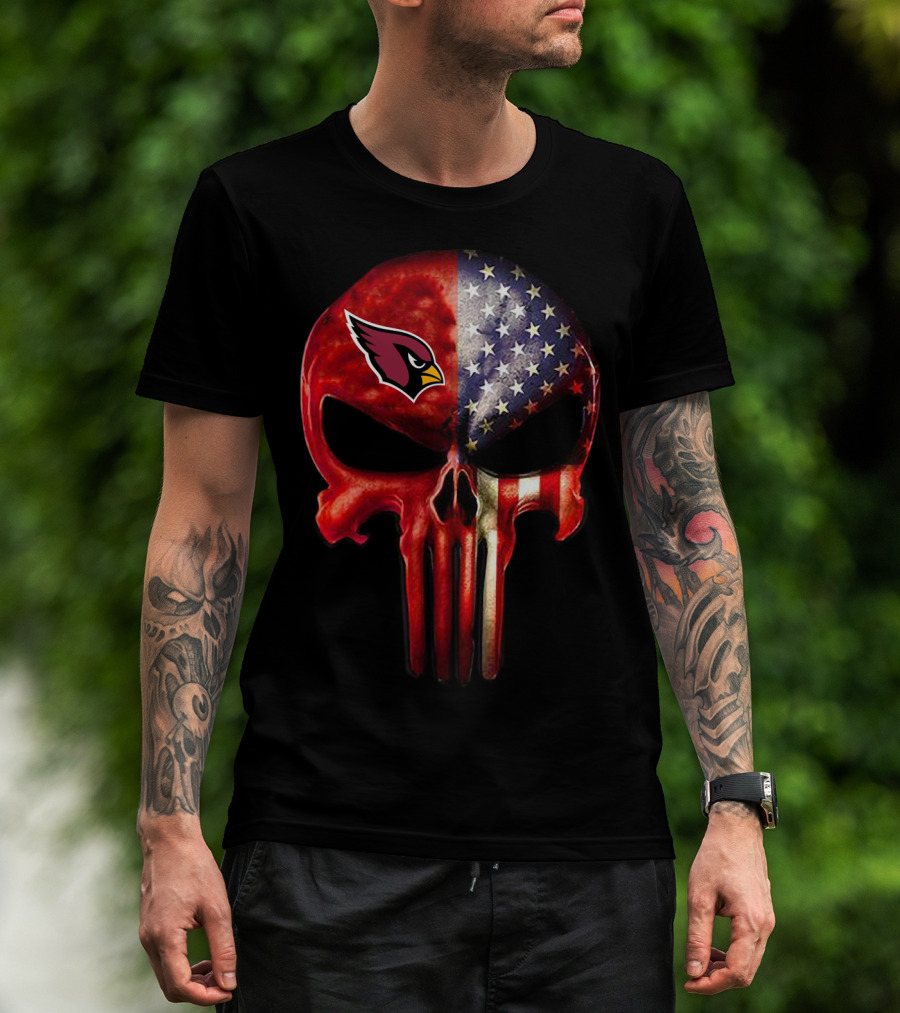 The Arizona Cardinals American Flag Skull T-shirt is designed for everyday wear and a consistent fit. Fabric is pre-shrunk ring-spun cotton with durable stitching. See the size chart below for exact measurements.