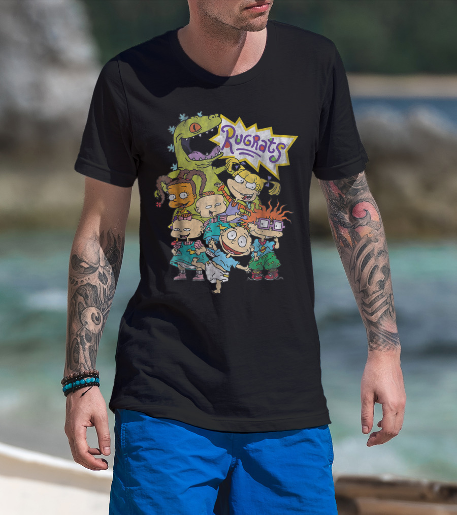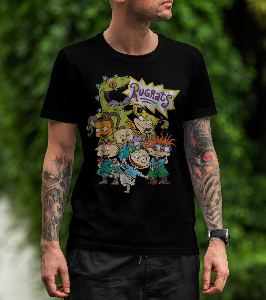 The Nickelodeon Rugrats Happy Character Party Group Featuring Reptar and Animated Cast T-shirt is designed for everyday wear and a consistent fit. Fabric is pre-shrunk ring-spun cotton with durable stitching. See the size chart below for exact measurements.