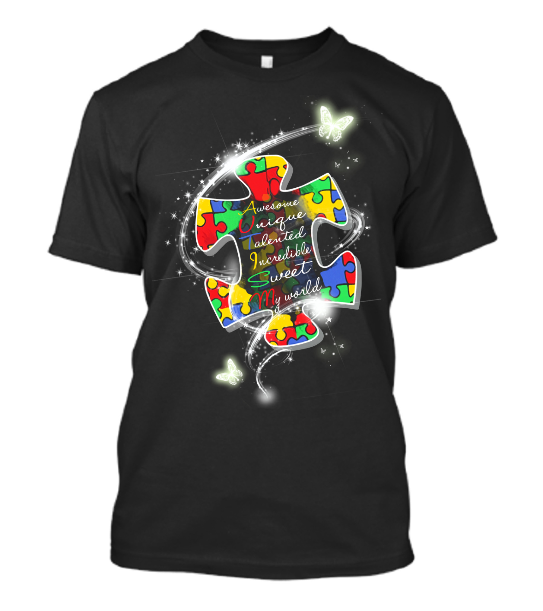The Awesome Unique Talented Incredible Sweet My World Puzzle Piece with Butterflies and Sparkles T-shirt is designed for everyday wear and a consistent fit. Fabric is pre-shrunk ring-spun cotton with durable stitching. See the size chart below for exact measurements.
