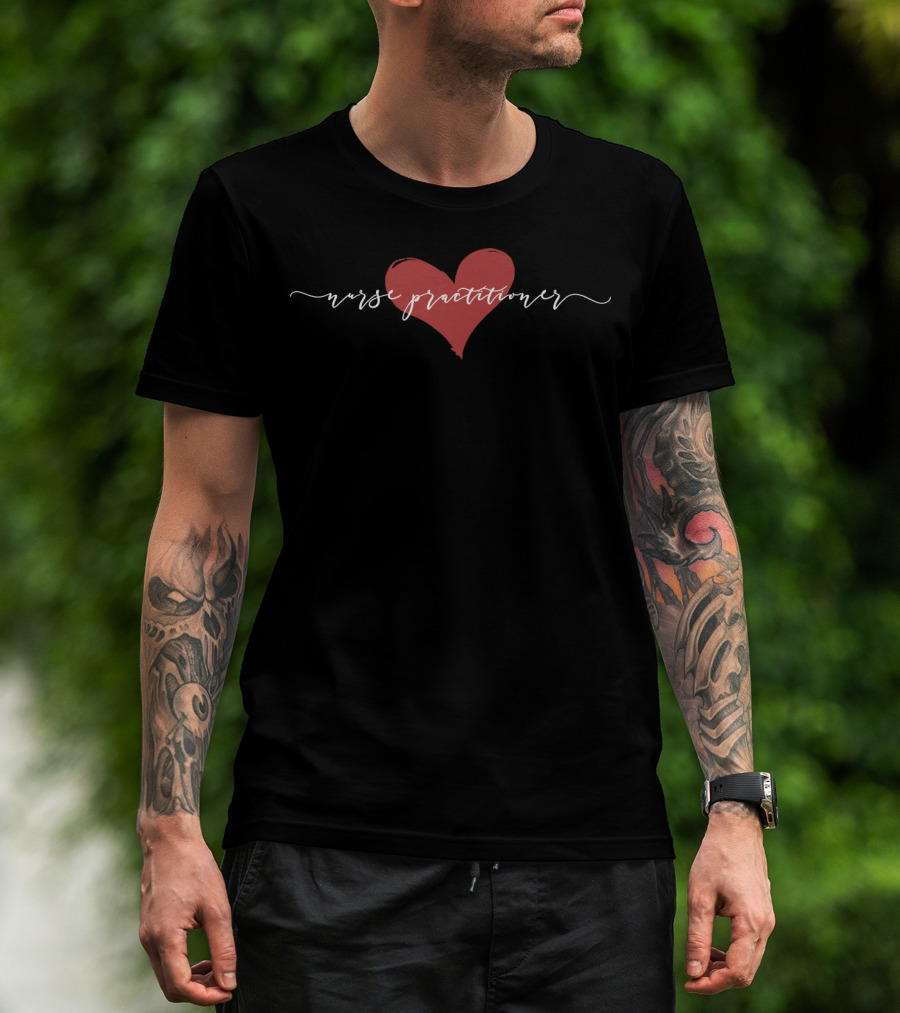 The Nurse Practitioner Heart T-shirt is designed for everyday wear and a consistent fit. Fabric is pre-shrunk ring-spun cotton with durable stitching. See the size chart below for exact measurements.