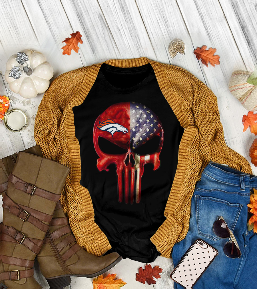 The Denver Broncos USA Punisher Skull T-shirt is designed for everyday wear and a consistent fit. Fabric is pre-shrunk ring-spun cotton with durable stitching. See the size chart below for exact measurements.