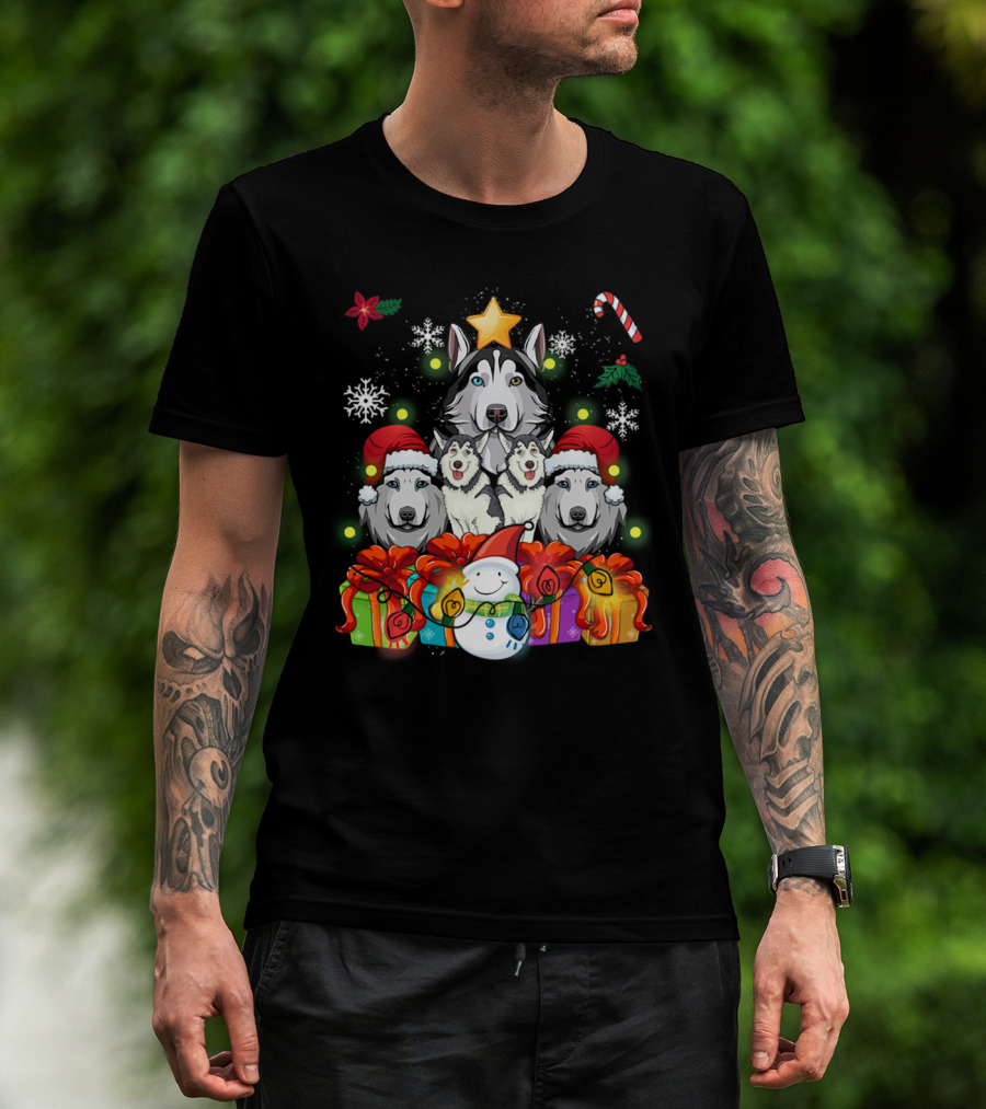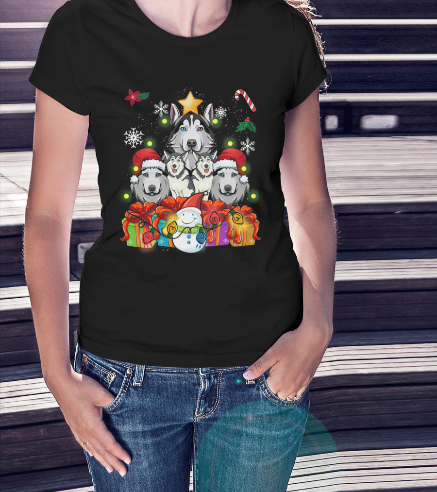 Siberian Husky Christmas Tree Decor With Snowflakes, Candy Cane, Snowman, And Presents T-Shirt