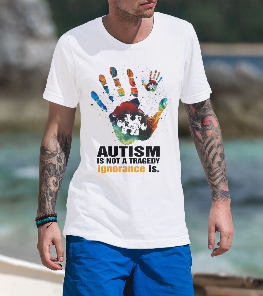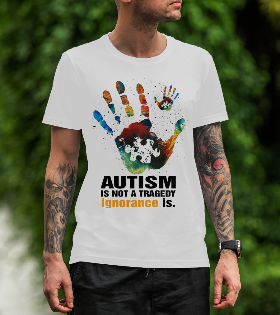 Autism Is Not A Tragedy Ignorance Is Colorful Handprint Puzzle Piece T-Shirt