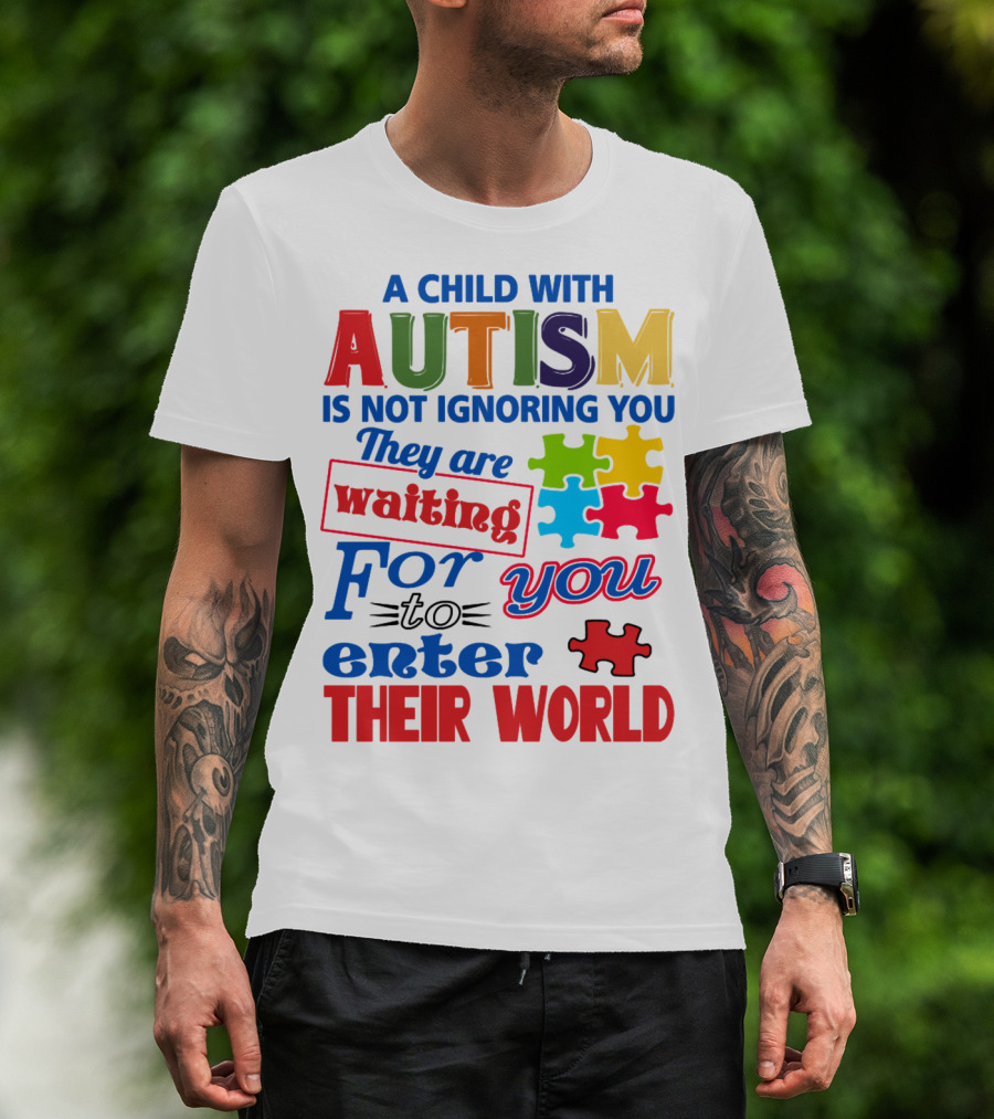 The A Child with Autism Is Not Ignoring You They Are Waiting for You to Enter Their World T-shirt is designed for everyday wear and a consistent fit. Fabric is pre-shrunk ring-spun cotton with durable stitching. See the size chart below for exact measurements.