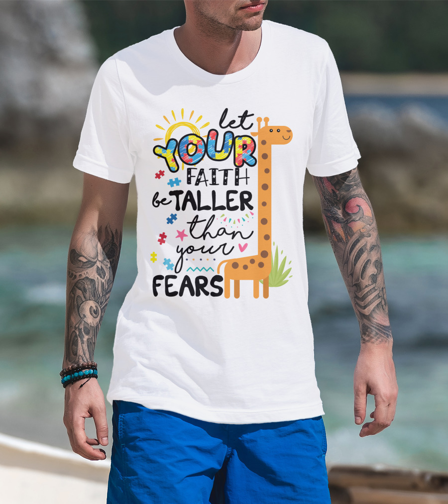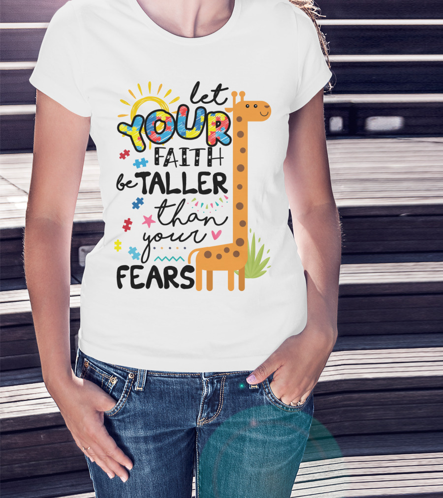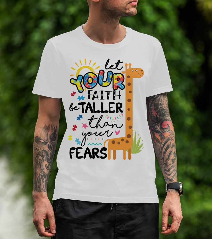 The let your faith be taller than your fears giraffe puzzle pieces T-shirt is designed for everyday wear and a consistent fit. Fabric is pre-shrunk ring-spun cotton with durable stitching. See the size chart below for exact measurements.