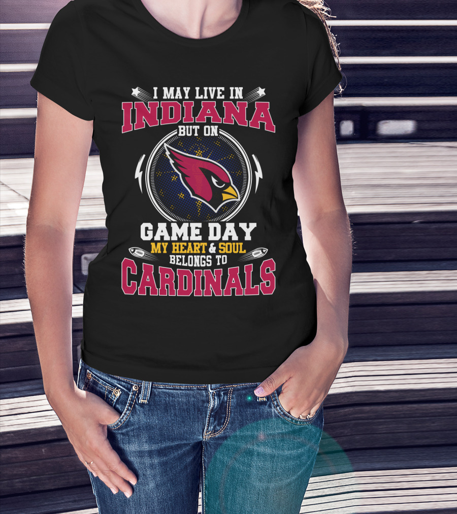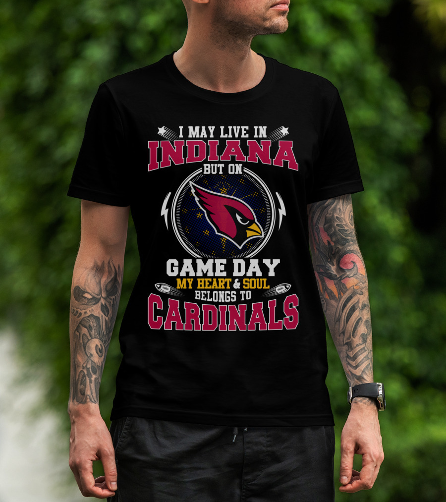 I MAY LIVE IN INDIANA BUT ON GAME DAY MY HEART And SOUL BELONGS TO CARDINALS T-Shirt