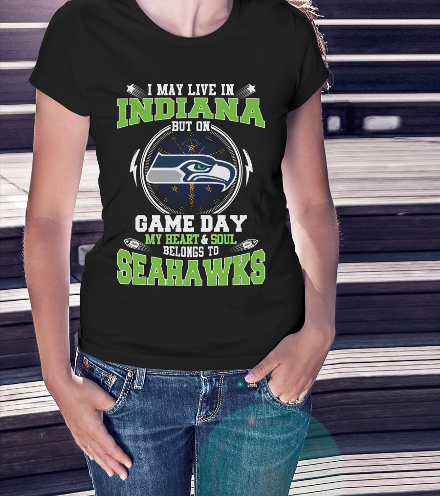 I MAY LIVE IN INDIANA BUT ON GAME DAY MY HEART And SOUL BELONGS TO SEAHAWKS T-Shirt
