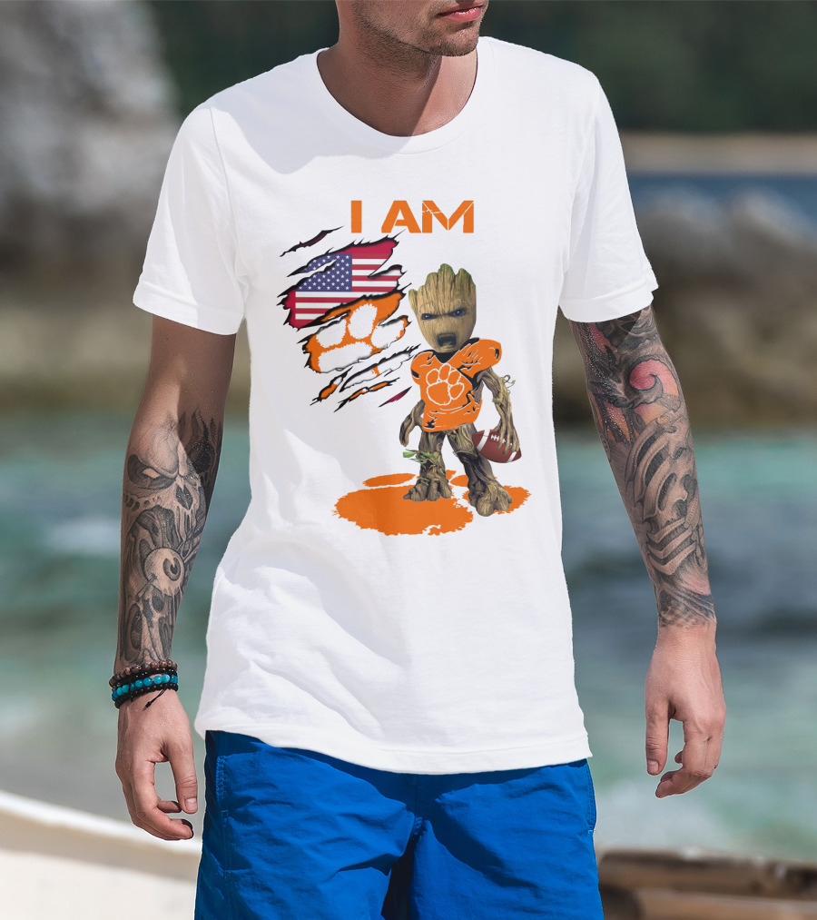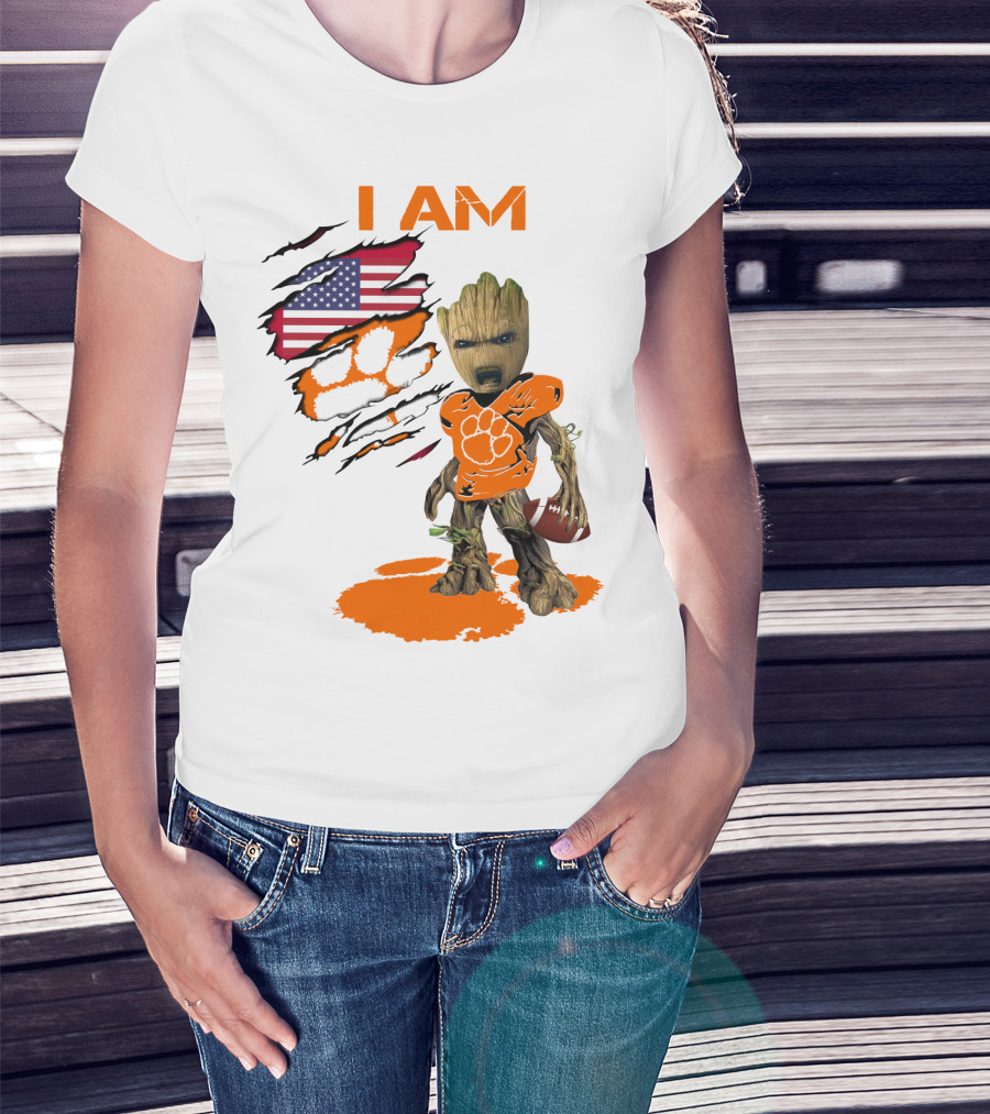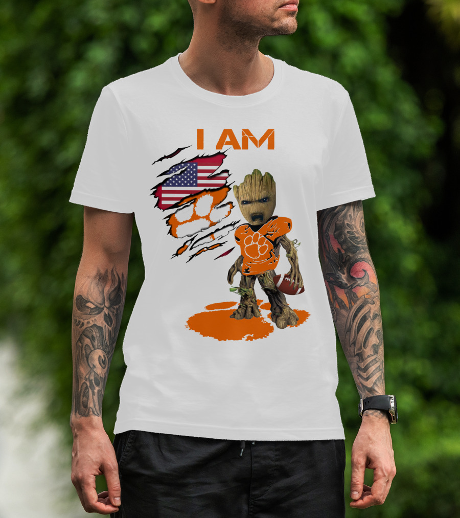 I AM Clemson Baby Groot American Flag Tiger Paw Football T-Shirt