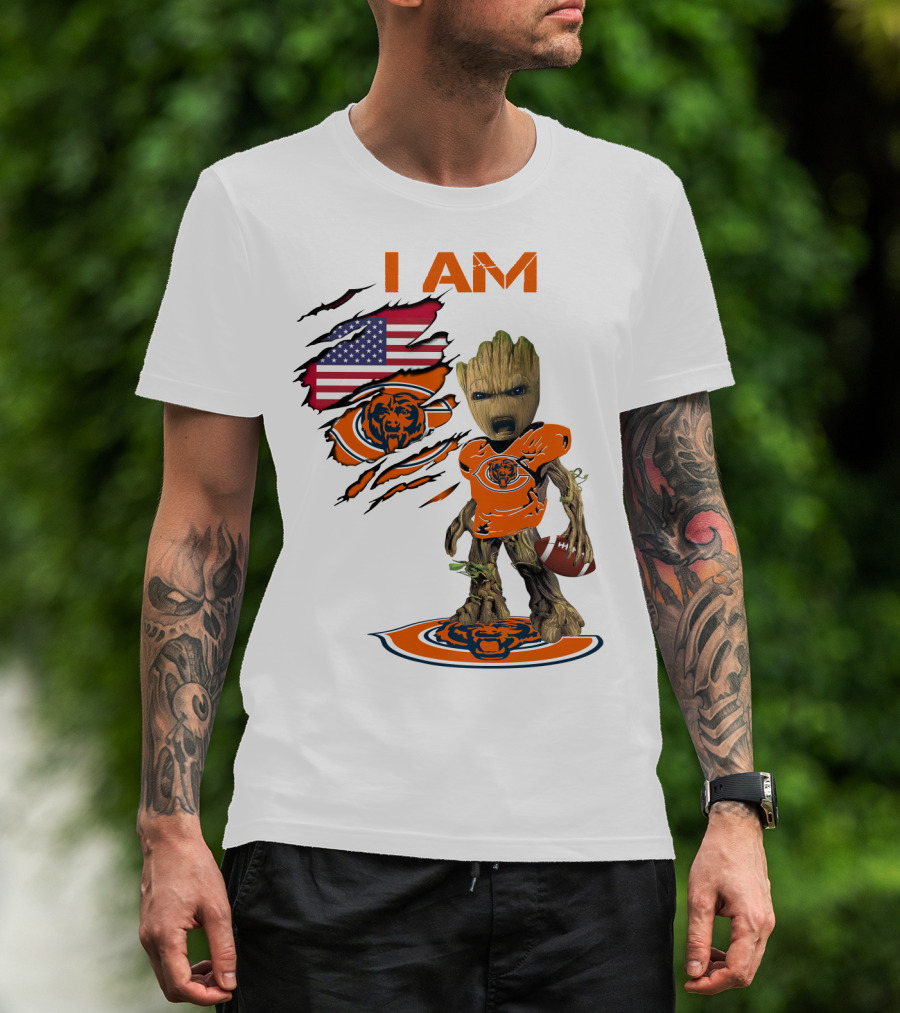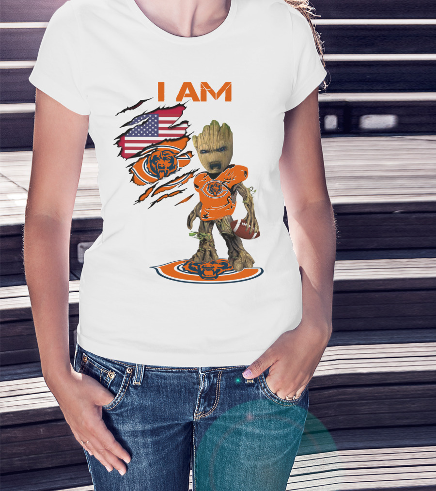 I AM Bears Baby Groot Holding Football With American Flag And Chicago Bears T-Shirt