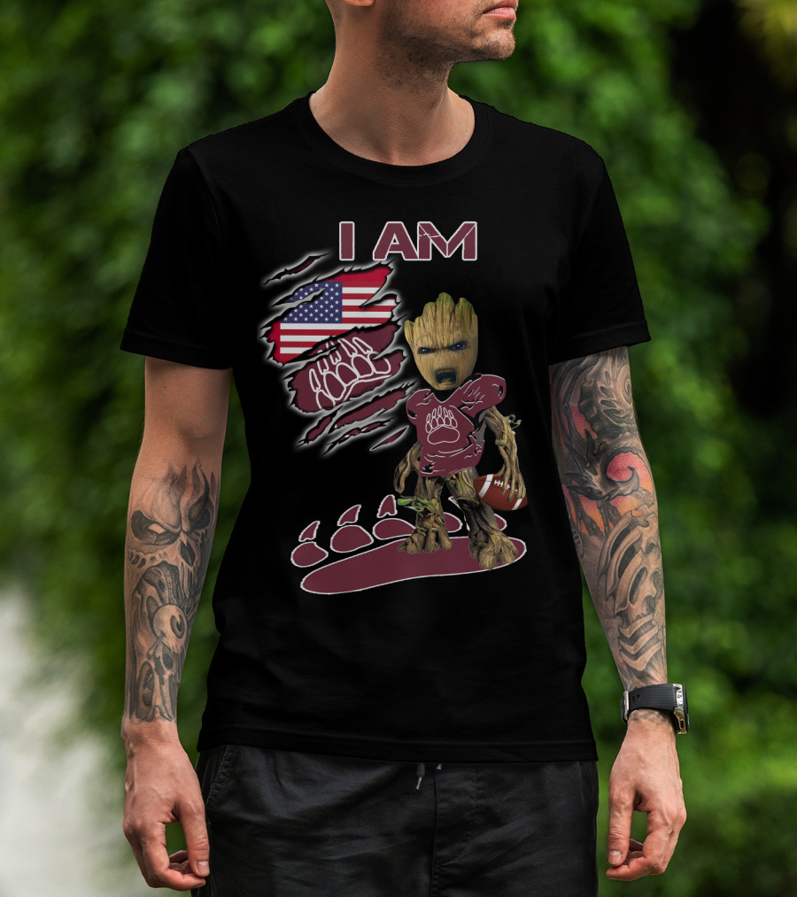 I AM American Flag Football Baby Groot Bear Paw T-Shirt
