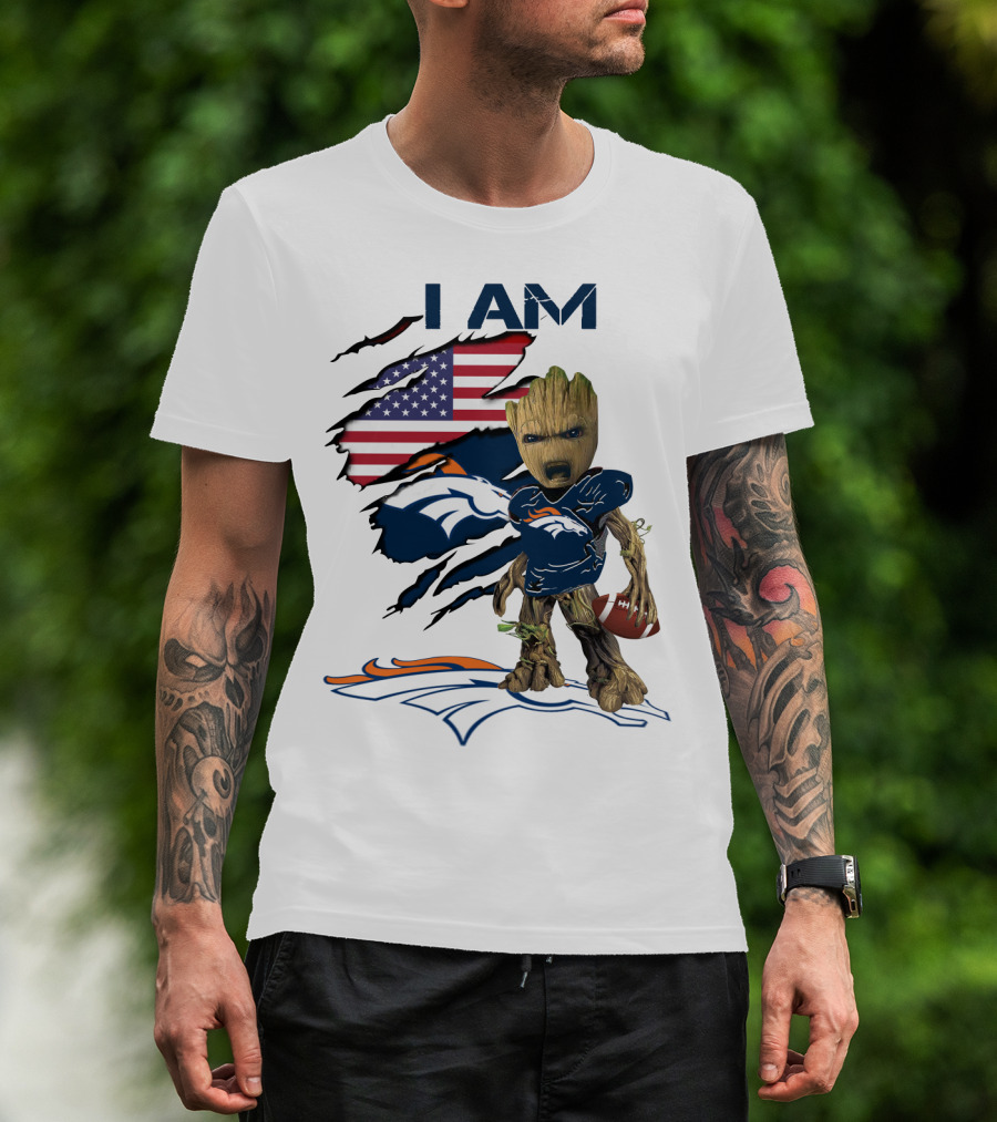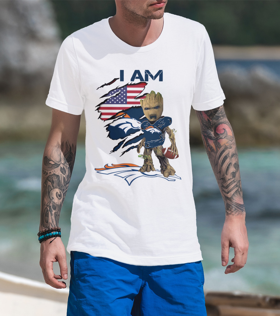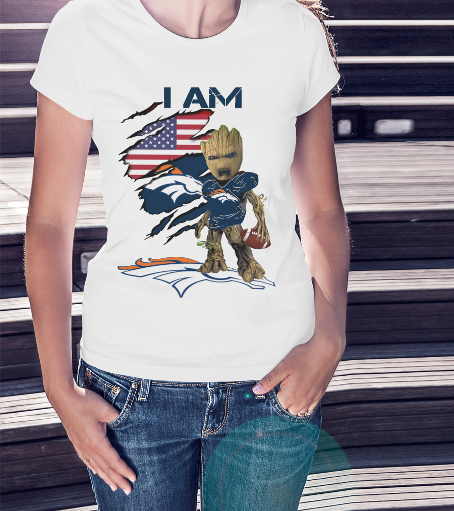 I Am Broncos Baby Groot American Flag Football T-Shirt