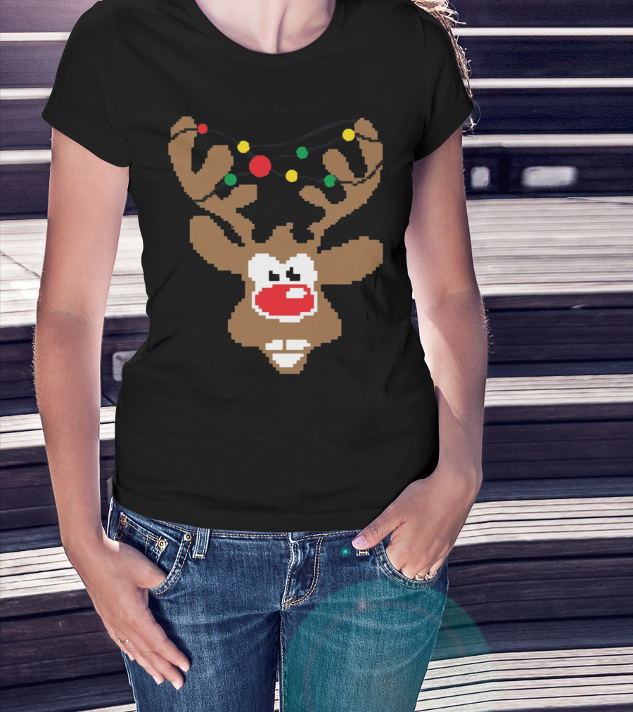 Christmas Youth Pixel Reindeer With Colorful Lights T-Shirt