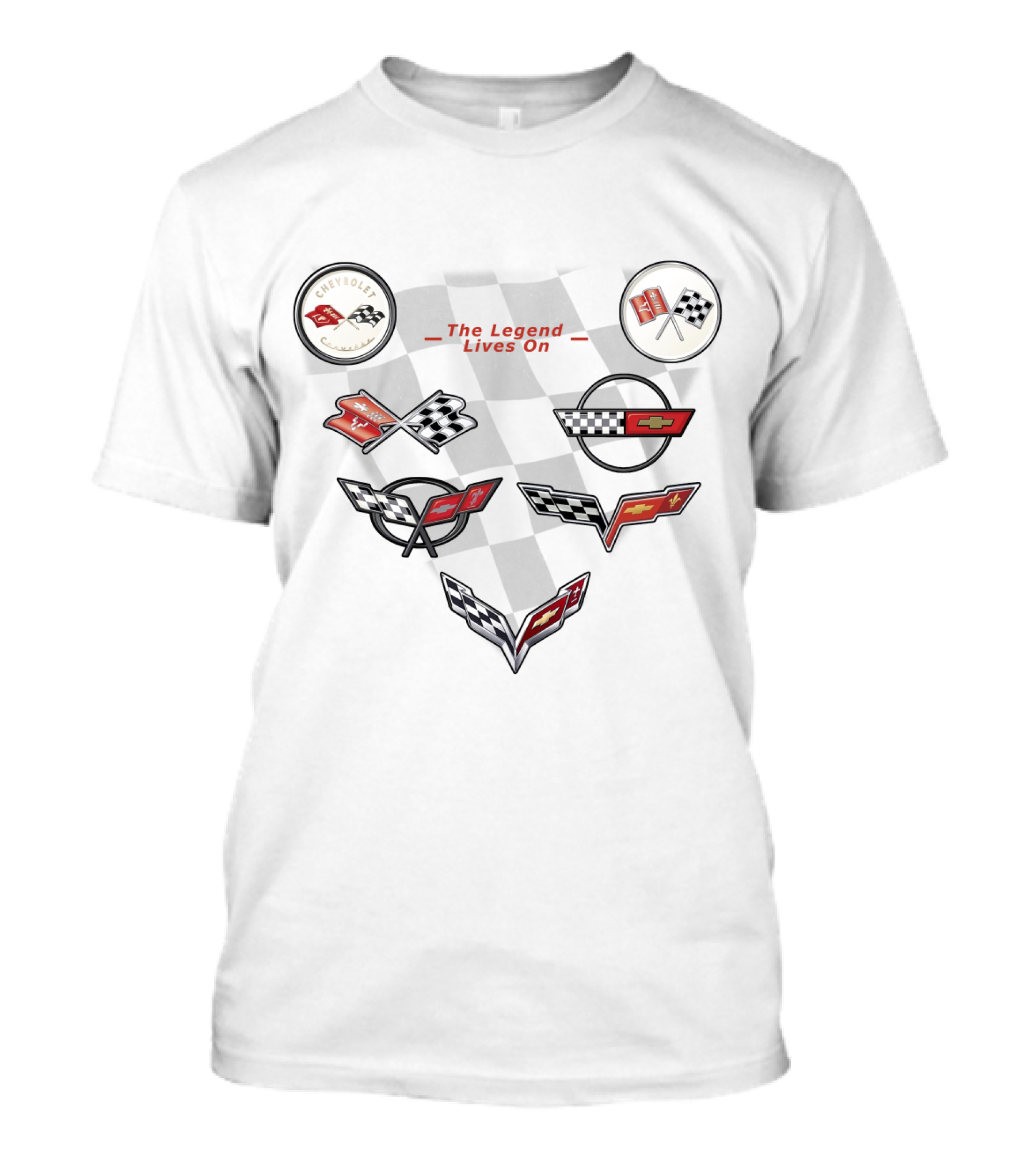The Chevrolet Corvette The Legend Lives On Racing Emblems Collection T-shirt is designed for everyday wear and a consistent fit. Fabric is pre-shrunk ring-spun cotton with durable stitching. See the size chart below for exact measurements.