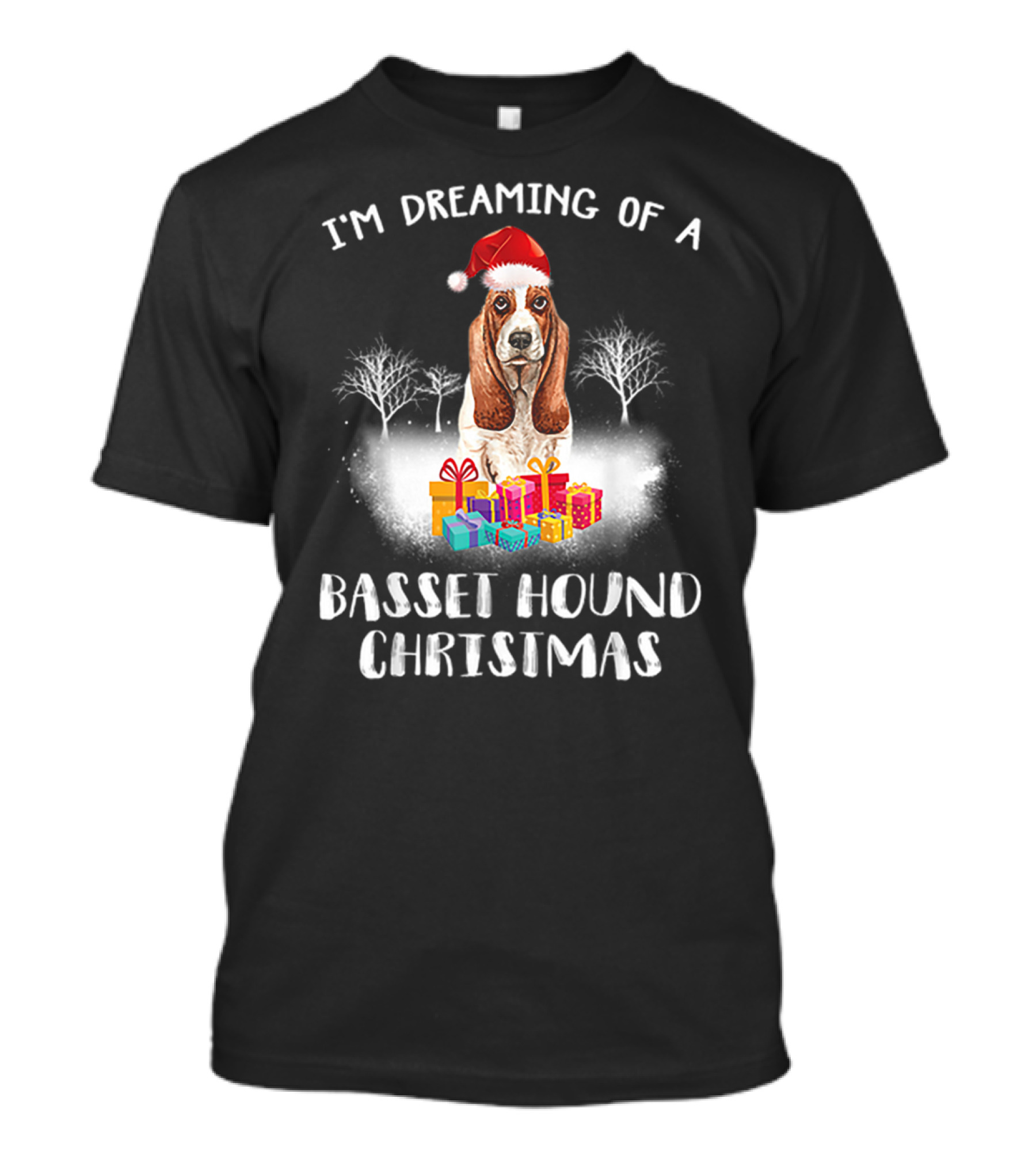 The I'm Dreaming of a Basset Hound Christmas T-shirt is designed for everyday wear and a consistent fit. Fabric is pre-shrunk ring-spun cotton with durable stitching. See the size chart below for exact measurements.