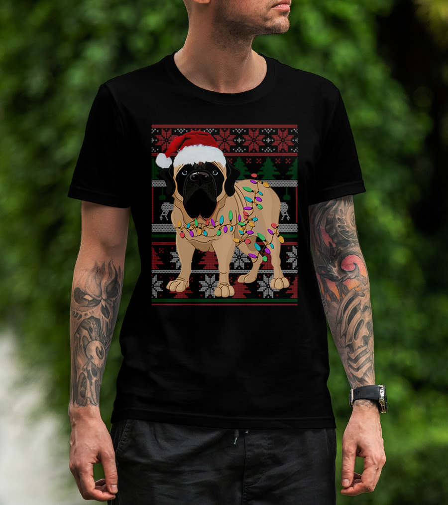 Santa Hat English Mastiff With Christmas Lights And Festive T-Shirt