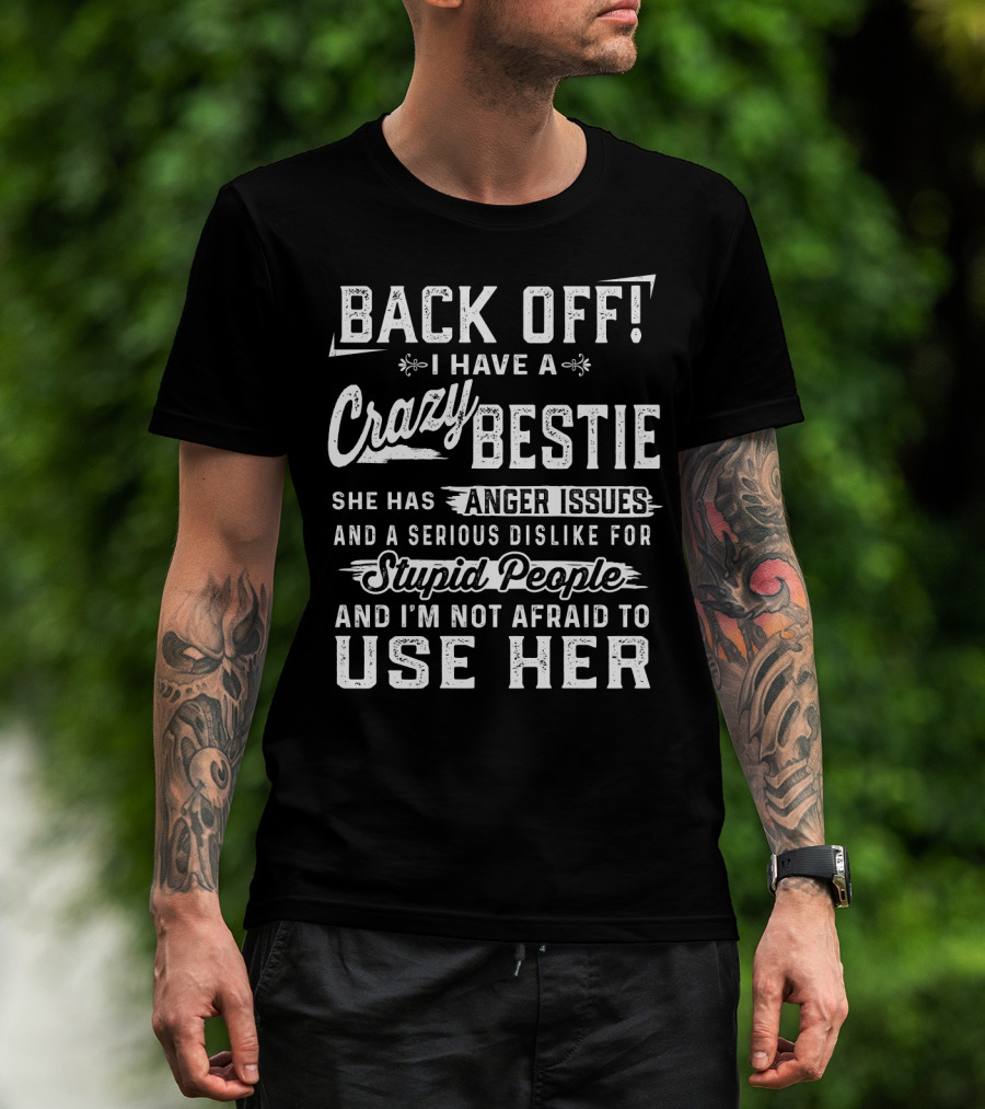 The Back Off I Have A Crazy Bestie She Has Anger Issues Dislike for Stupid People Use Her T-shirt is designed for everyday wear and a consistent fit. Fabric is pre-shrunk ring-spun cotton with durable stitching. See the size chart below for exact measurements.