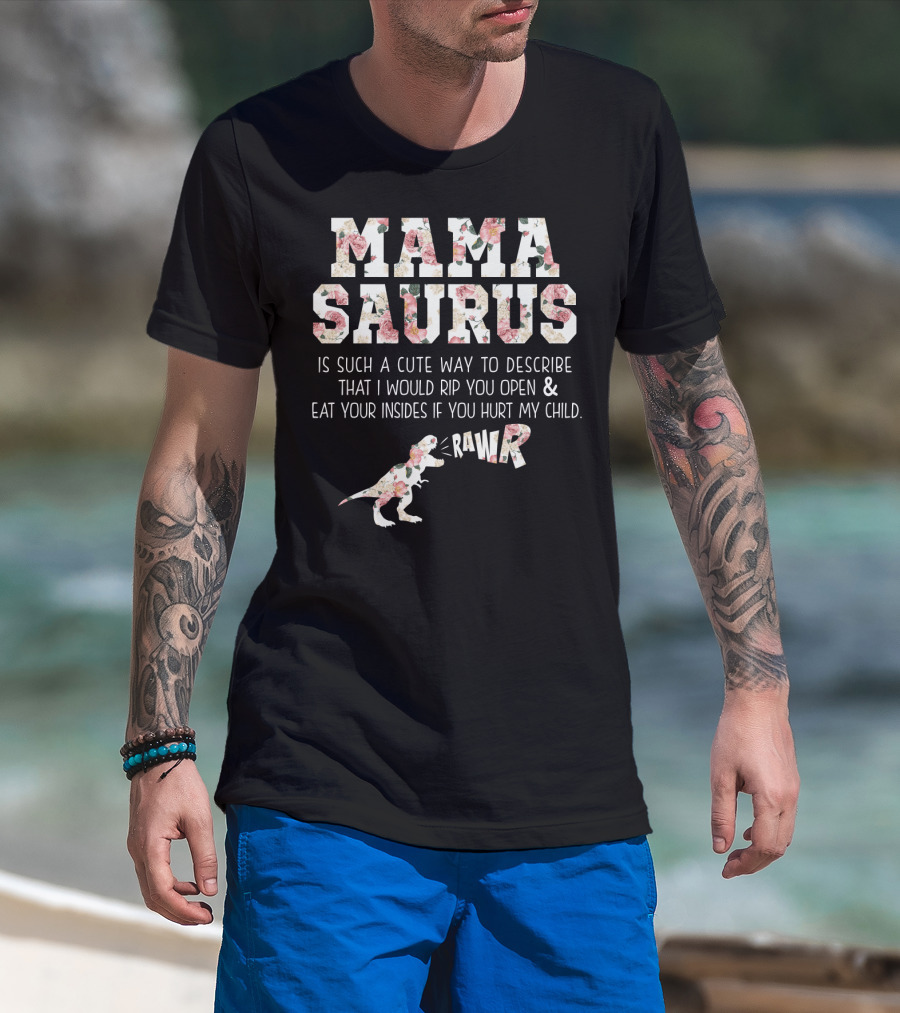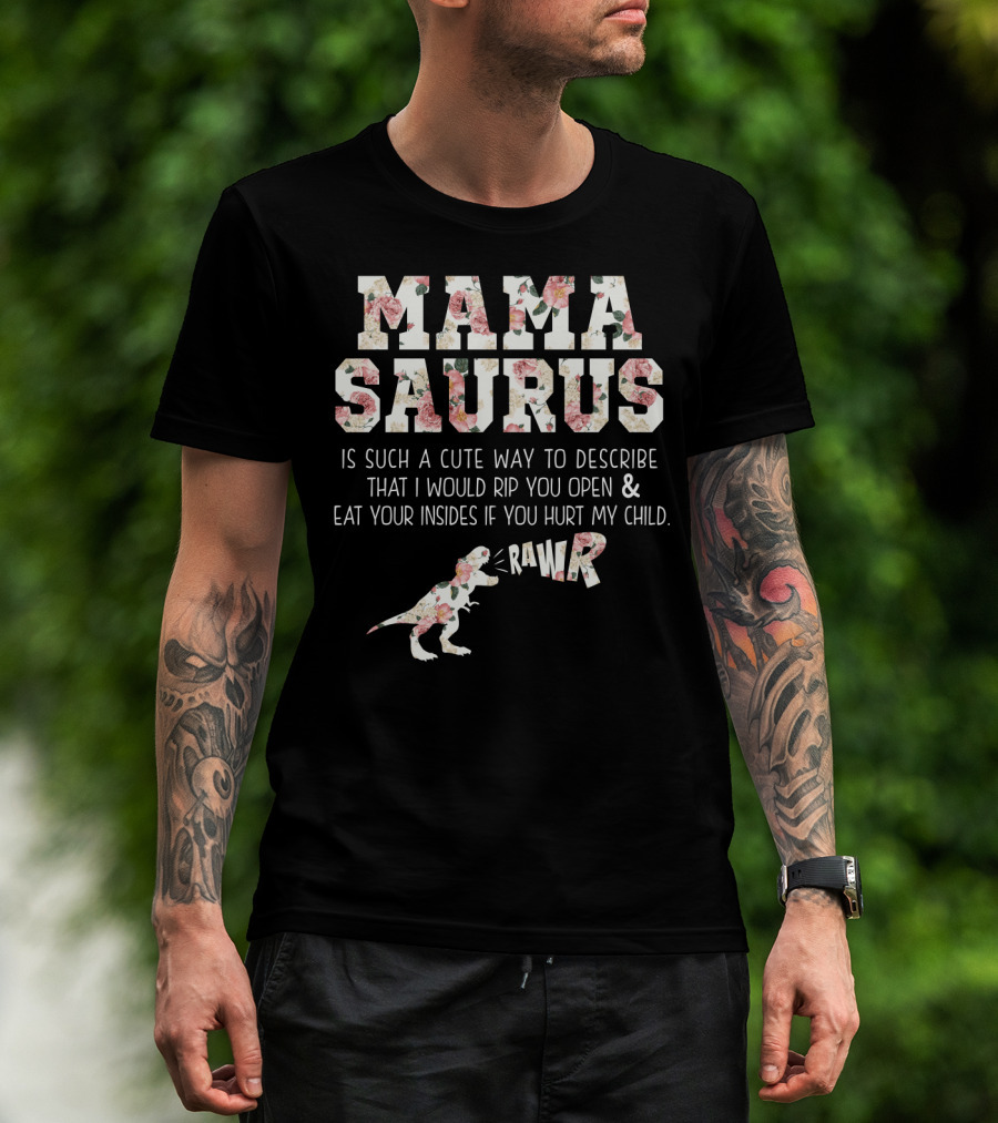 The MAMA SAURUS IS SUCH A CUTE WAY TO DESCRIBE THAT I WOULD RIP YOU OPEN and EAT YOUR INSIDES IF YOU HURT MY CHILD RAWR T-shirt is designed for everyday wear and a consistent fit. Fabric is pre-shrunk ring-spun cotton with durable stitching. See the size chart below for exact measurements.