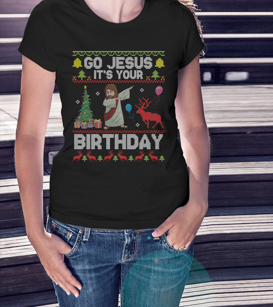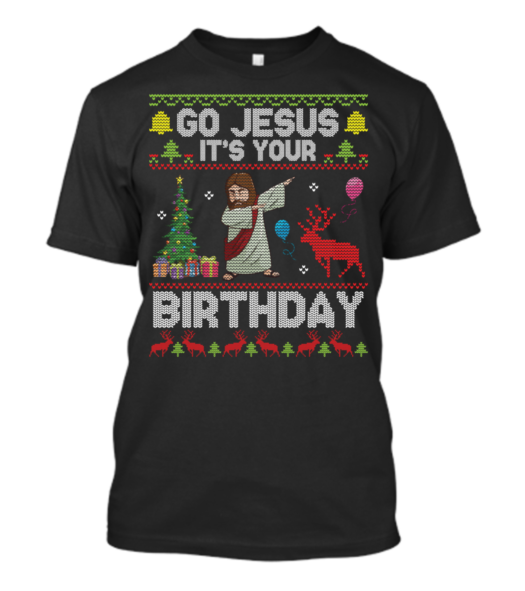 The Go Jesus It's Your Birthday Dabbing Christmas Tree Reindeer Decor T-shirt is designed for everyday wear and a consistent fit. Fabric is pre-shrunk ring-spun cotton with durable stitching. See the size chart below for exact measurements.