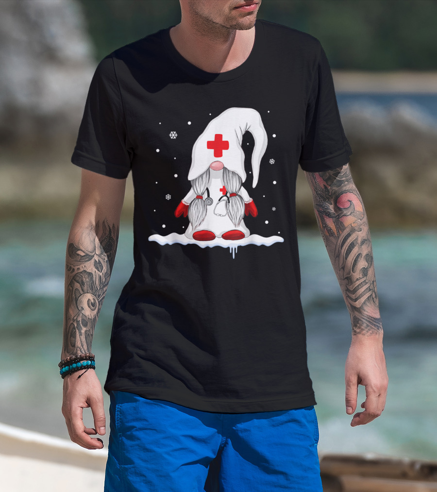 Gnome Nurse With Stethoscope And Red Cross Winter Scene T-Shirt