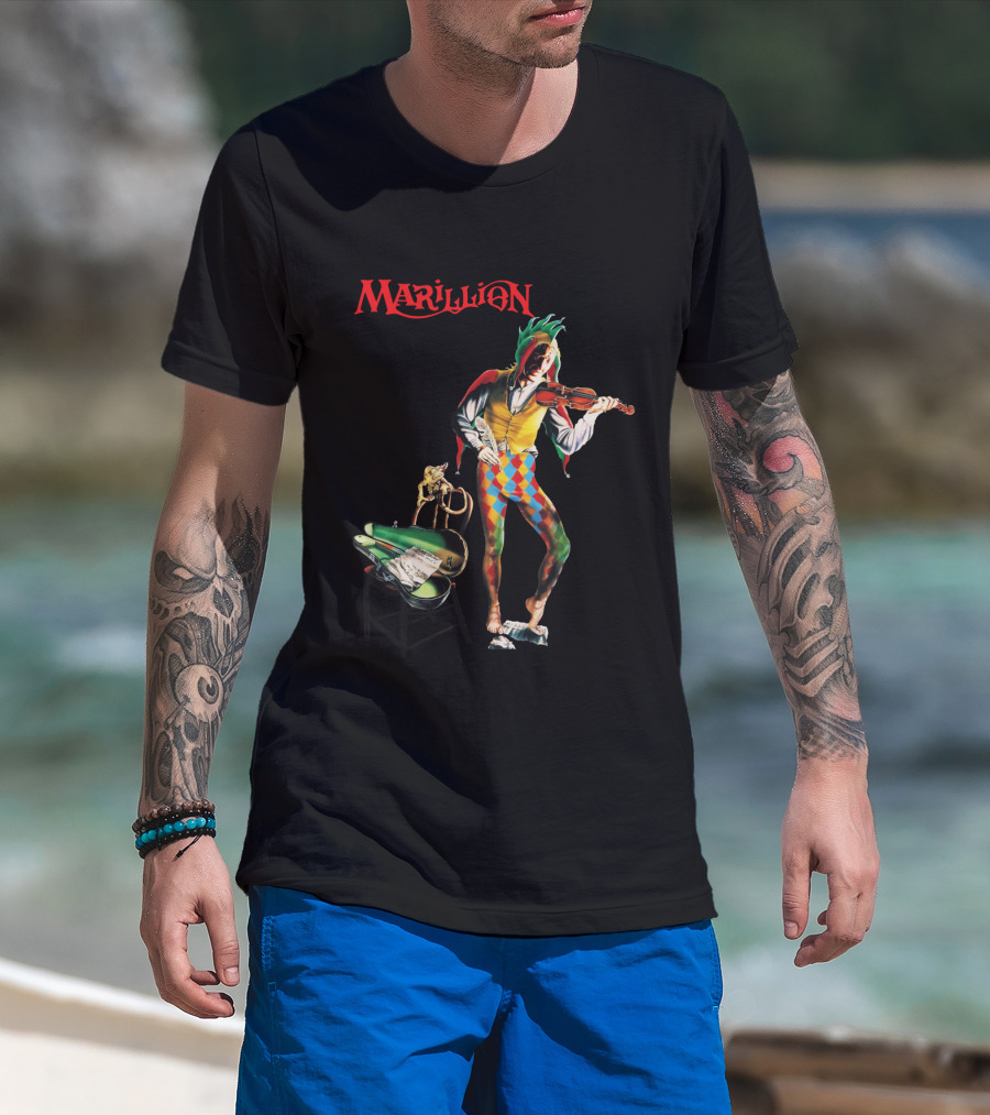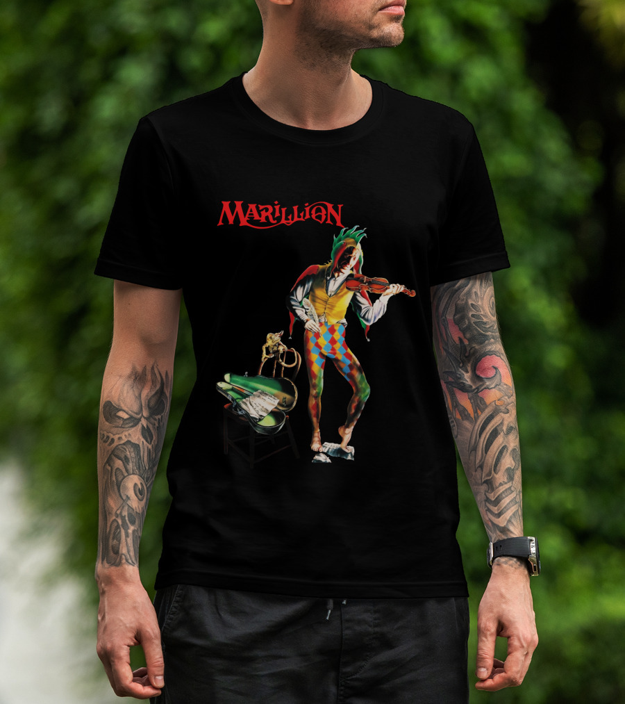 The Marillion Script For a Jester's Tear Violin Playing Jester with Sheet Music and Harlequin Colors T-shirt is designed for everyday wear and a consistent fit. Fabric is pre-shrunk ring-spun cotton with durable stitching. See the size chart below for exact measurements.