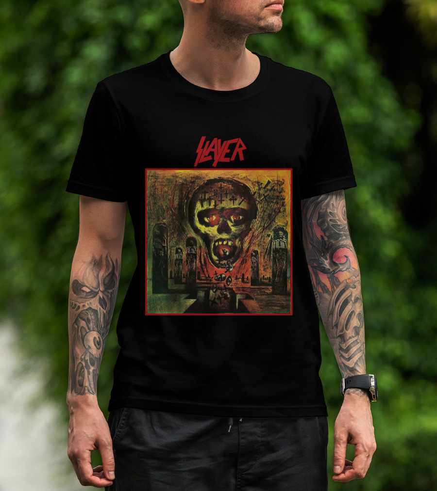 The Slayer Seasons in the Abyss Skull T-shirt is designed for everyday wear and a consistent fit. Fabric is pre-shrunk ring-spun cotton with durable stitching. See the size chart below for exact measurements.