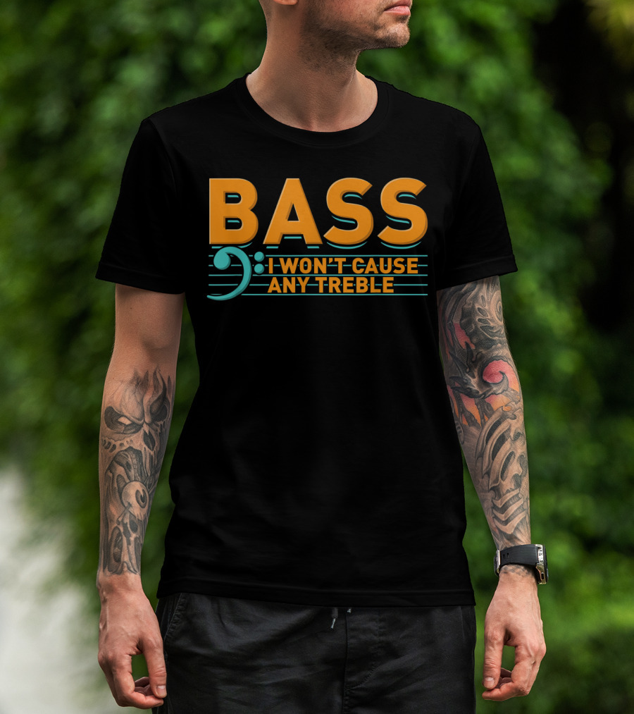 The Bass I Won't Cause Any Treble T-shirt is designed for everyday wear and a consistent fit. Fabric is pre-shrunk ring-spun cotton with durable stitching. See the size chart below for exact measurements.