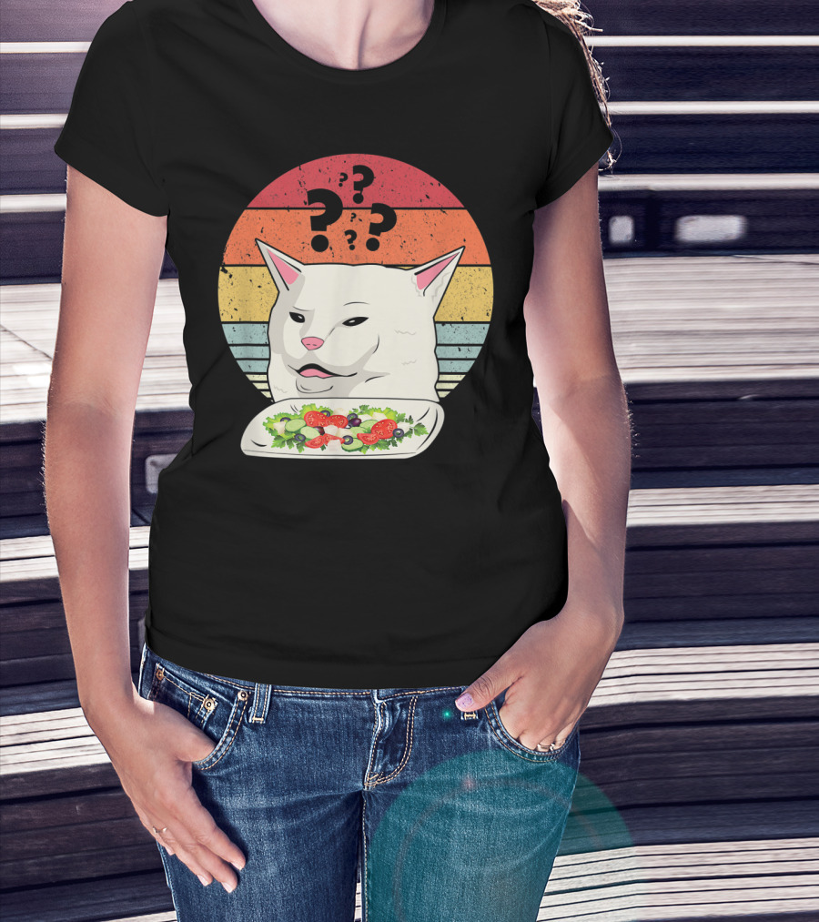 Cat Meme Confused Expression With Salad And Retro Color Stripes T-Shirt