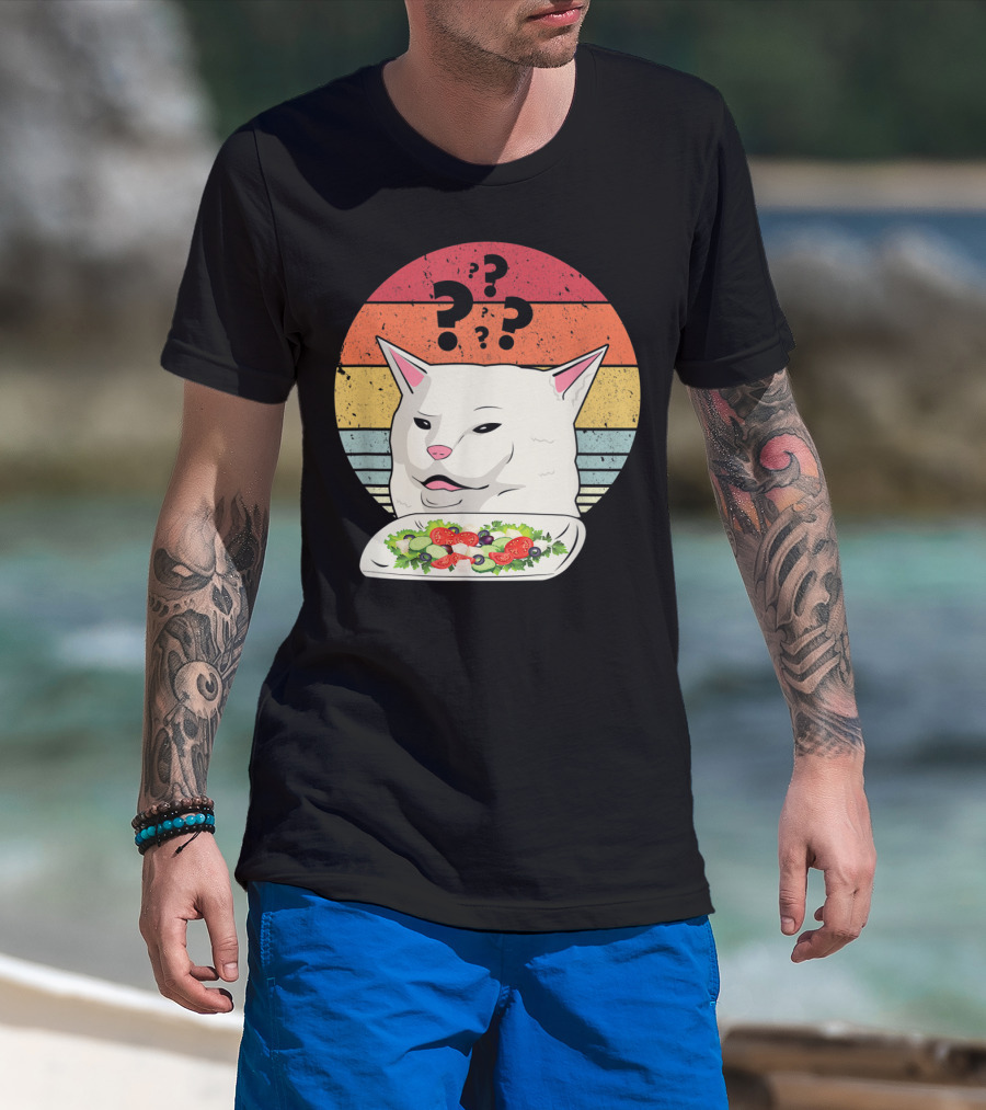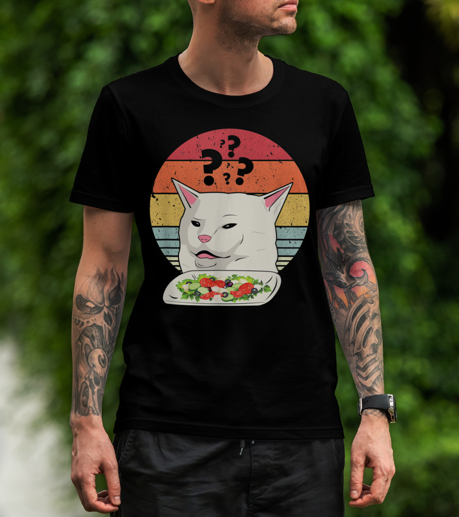 The Cat Meme Confused Expression with Salad and Retro Color Stripes T-shirt is designed for everyday wear and a consistent fit. Fabric is pre-shrunk ring-spun cotton with durable stitching. See the size chart below for exact measurements.