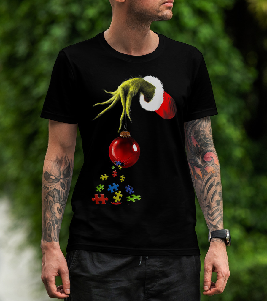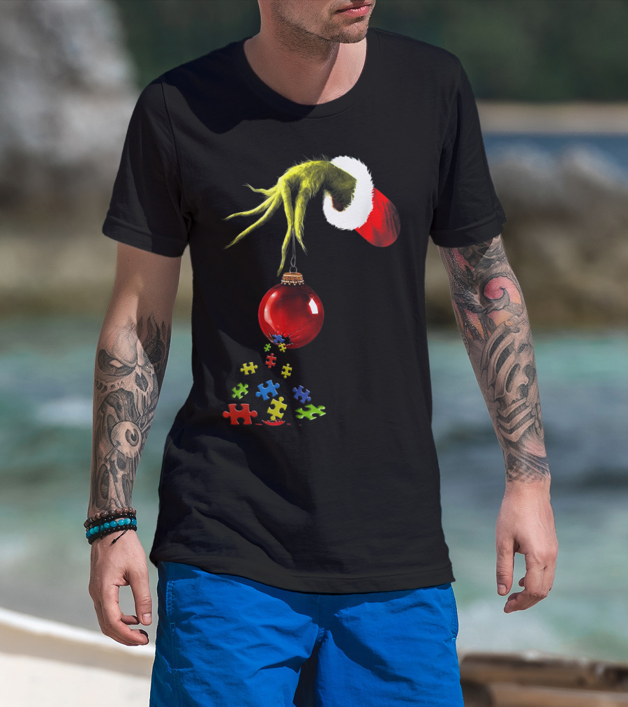 Grinch Hand Holding Red Ornament With Autism Puzzle Pieces T-Shirt