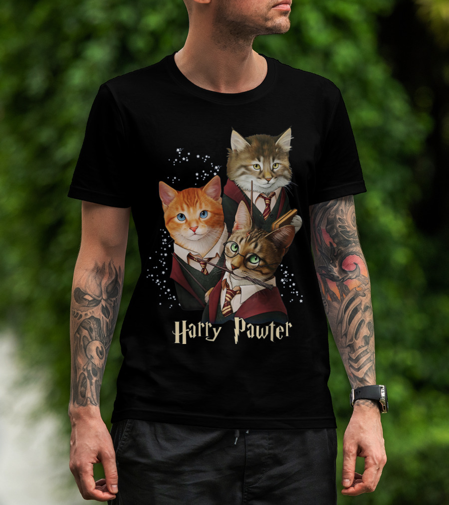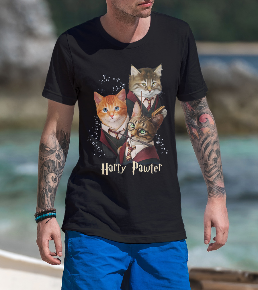 Harry Pawter Cats In Wizard Robes With Wands And Glasses T-Shirt