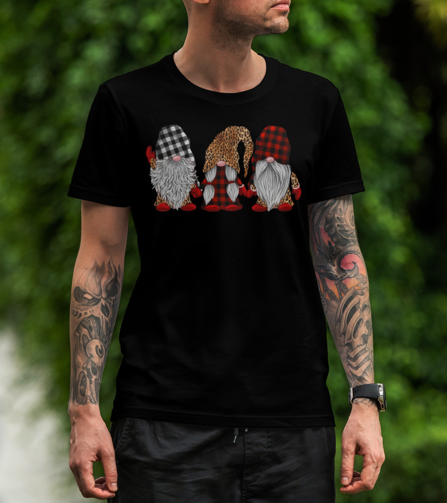 Three Gnomes In Black White Red Plaid And Leopard T-Shirt