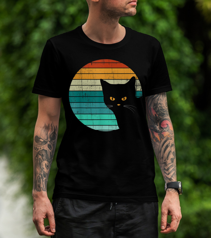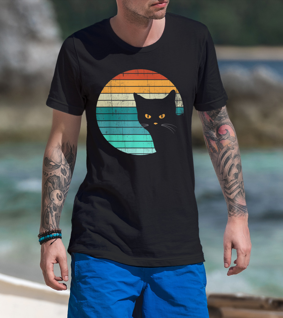The Unique Vintage Kitten Kitty Cat Retro Sunset Stripes T-shirt is designed for everyday wear and a consistent fit. Fabric is pre-shrunk ring-spun cotton with durable stitching. See the size chart below for exact measurements.