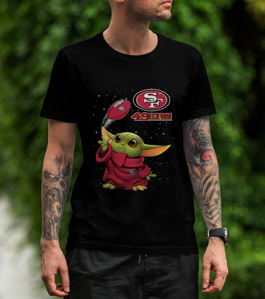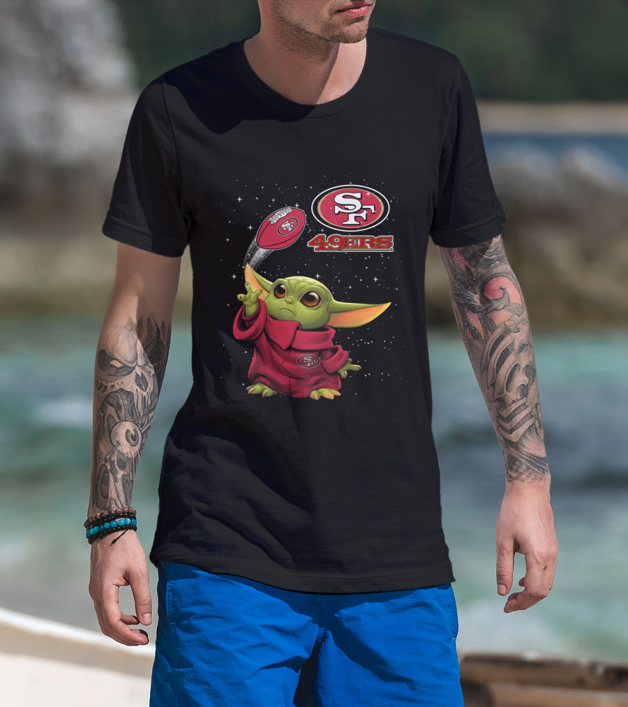 Baby Yoda Throwing San Francisco 49ers Football With SF Logo And Stars T-Shirt