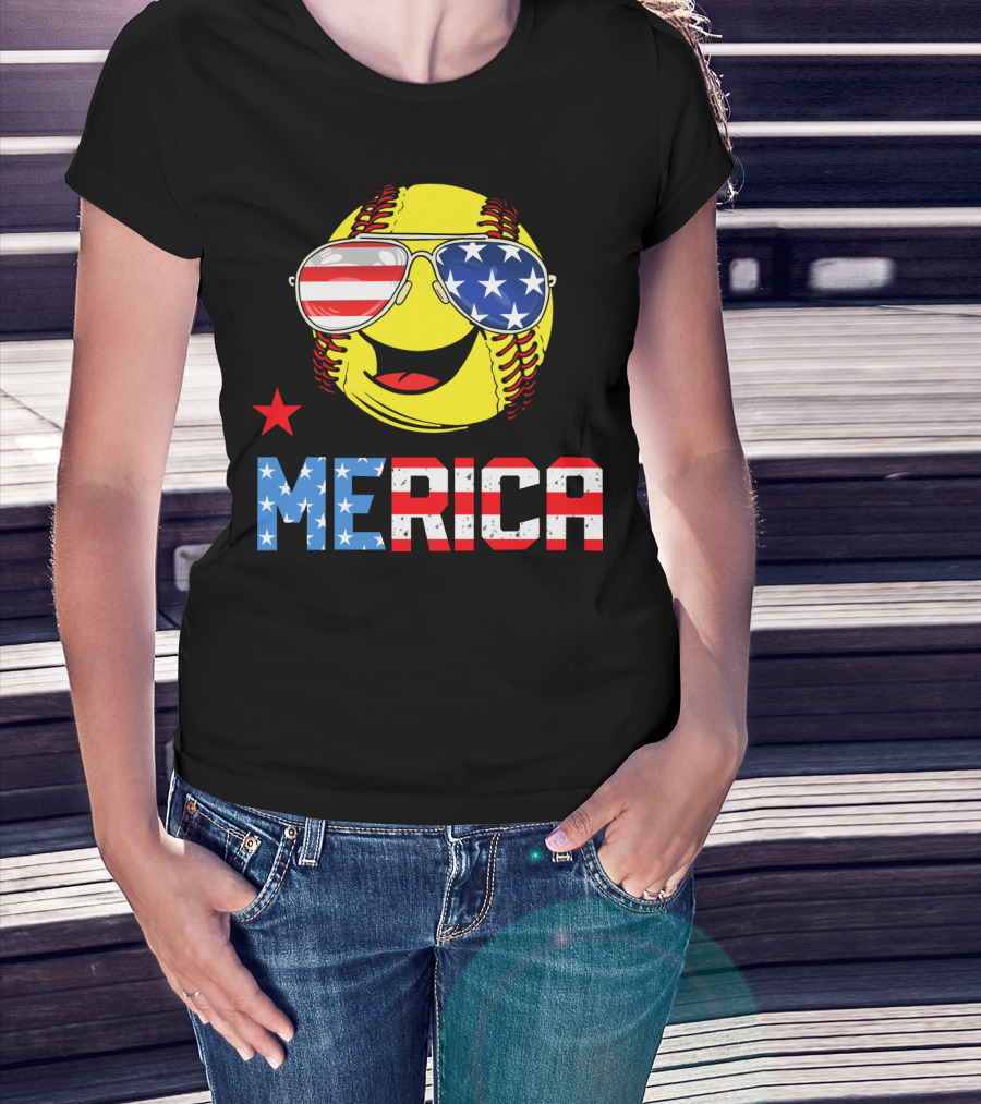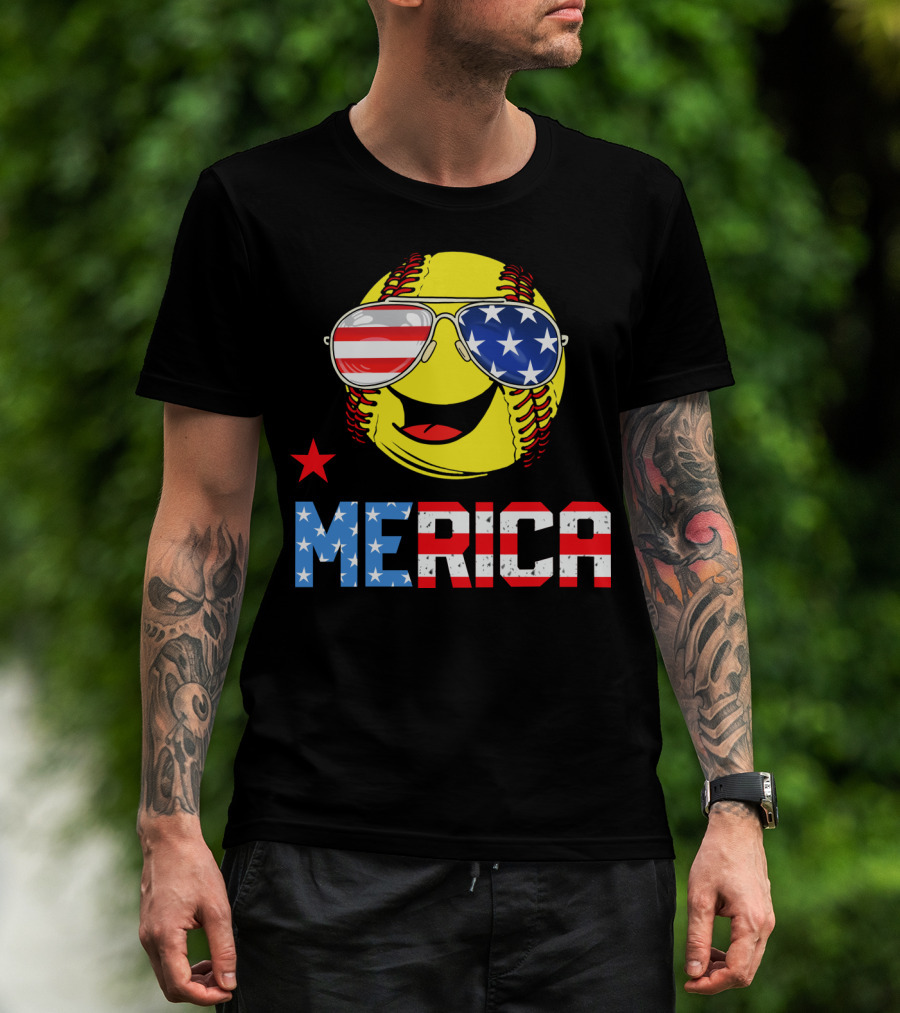 Softball MERICA Smiling Baseball With American Flag Sunglasses T-Shirt