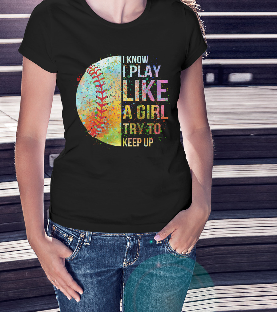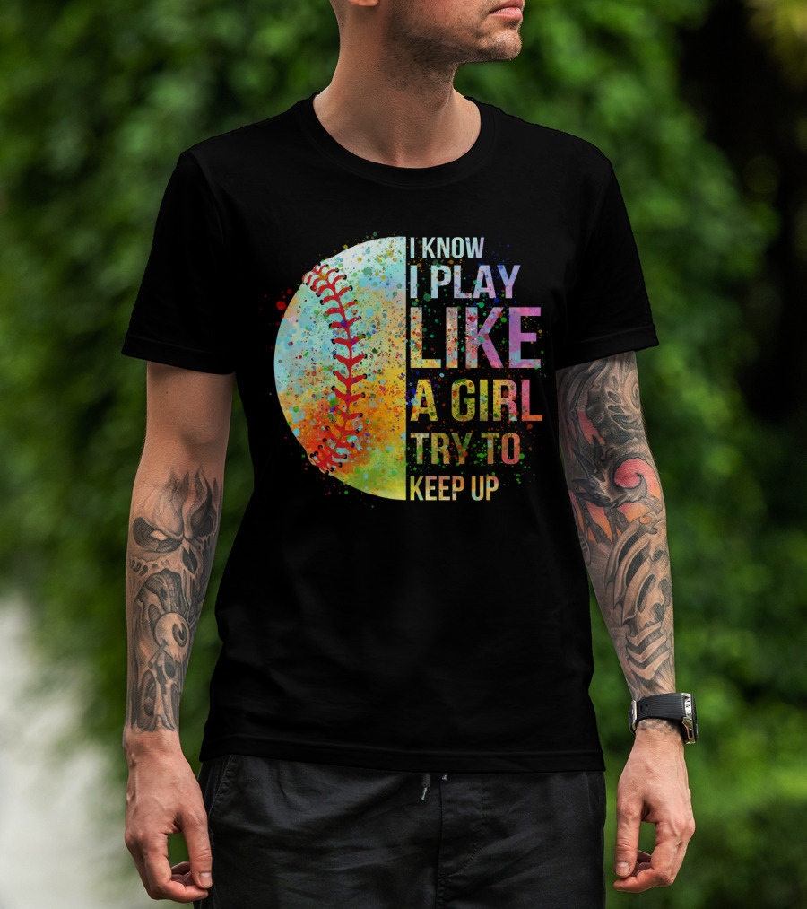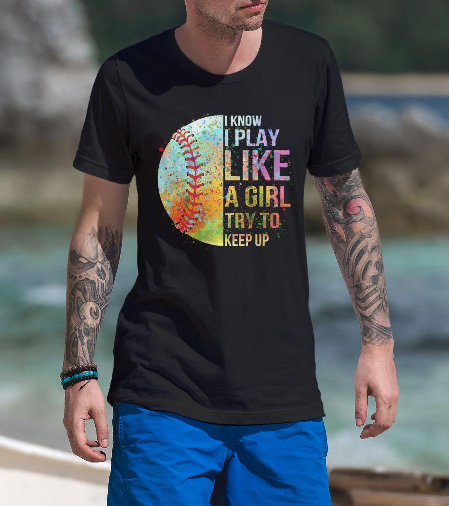 I Know I Play Like A Girl Try To Keep Up Baseball Colorful Splatter T-Shirt