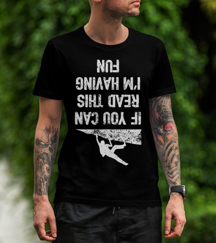 The Bouldering Climb Workout Rock Climbing If You Can Read This I'm Having Fun T-shirt is designed for everyday wear and a consistent fit. Fabric is pre-shrunk ring-spun cotton with durable stitching. See the size chart below for exact measurements.