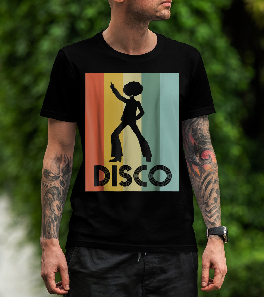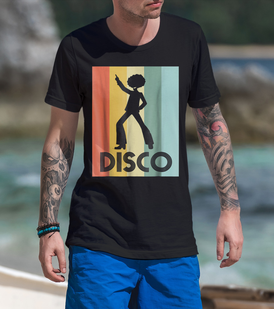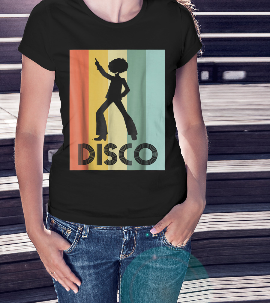The 70s Disco Dancing Silhouette Retro Stripes T-shirt is designed for everyday wear and a consistent fit. Fabric is pre-shrunk ring-spun cotton with durable stitching. See the size chart below for exact measurements.