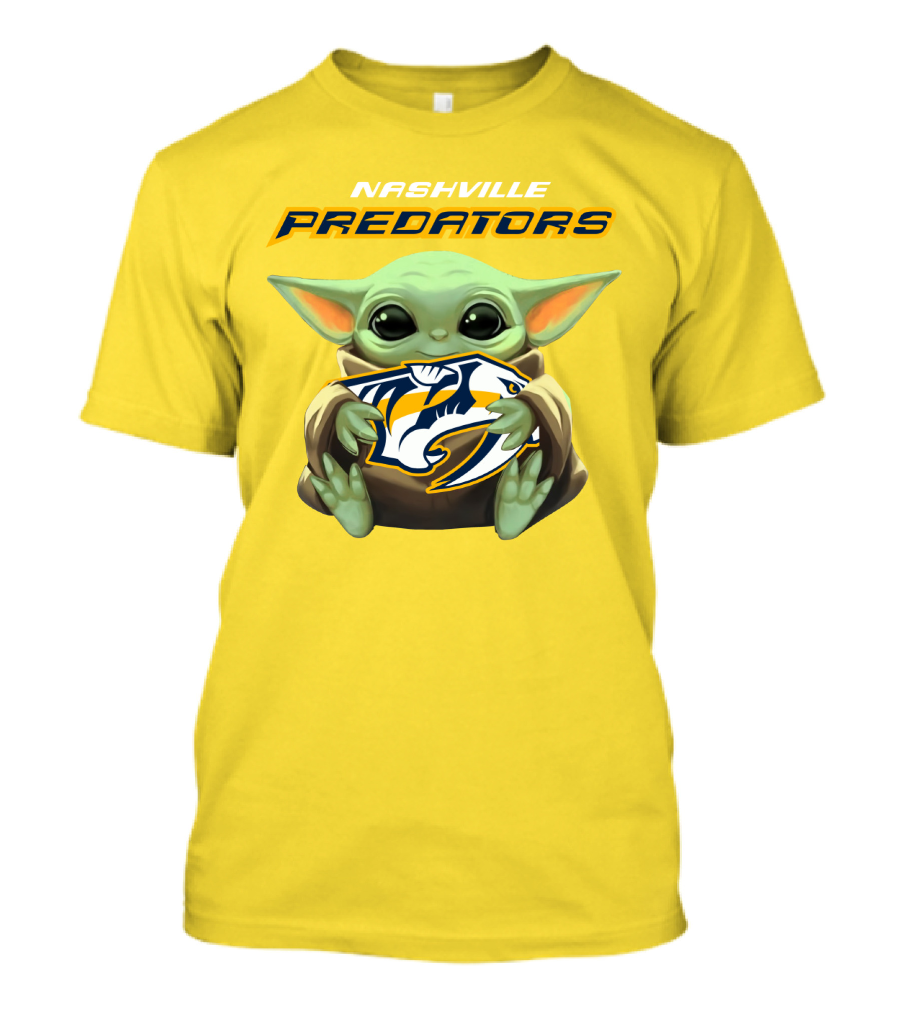 The Nashville Predators Baby Yoda Hugging T-shirt is designed for everyday wear and a consistent fit. Fabric is pre-shrunk ring-spun cotton with durable stitching. See the size chart below for exact measurements.