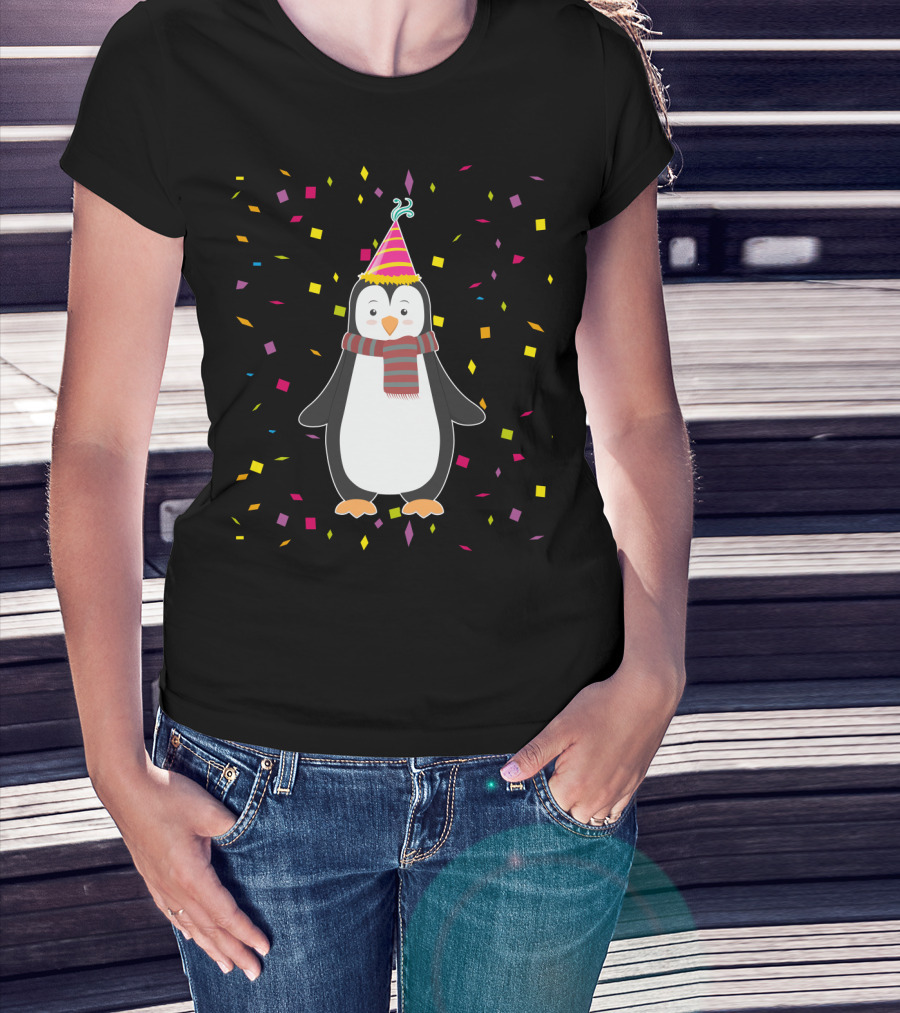 Funny Penguin Birthday Confetti Celebration With Party Hat And Scarf T-Shirt