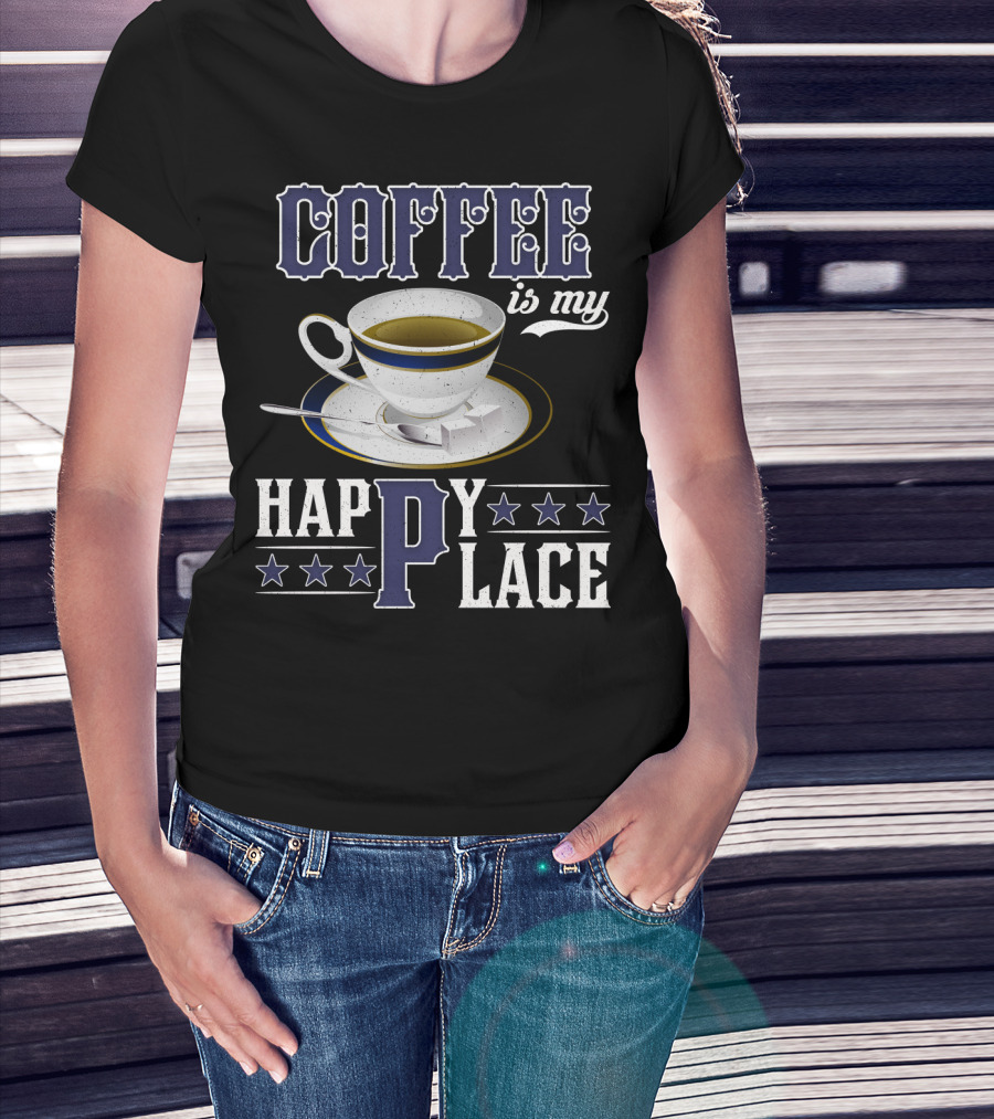 COFFEE Is My Happy Place Cup Saucer Sugar Cubes Stars T-Shirt
