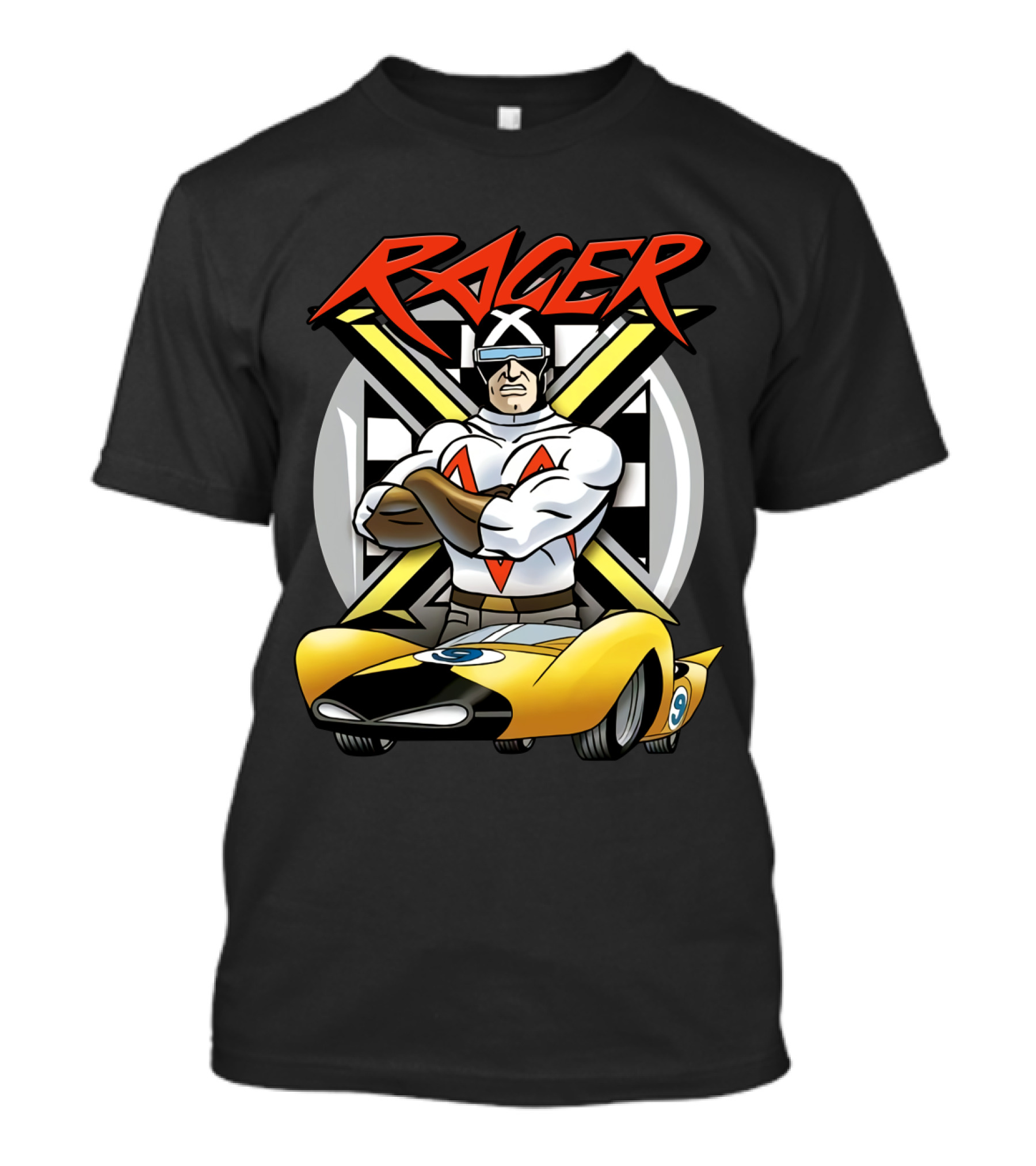 The Racer Speed Racer Character with Yellow Car and Checkered Flag Background T-shirt is designed for everyday wear and a consistent fit. Fabric is pre-shrunk ring-spun cotton with durable stitching. See the size chart below for exact measurements.