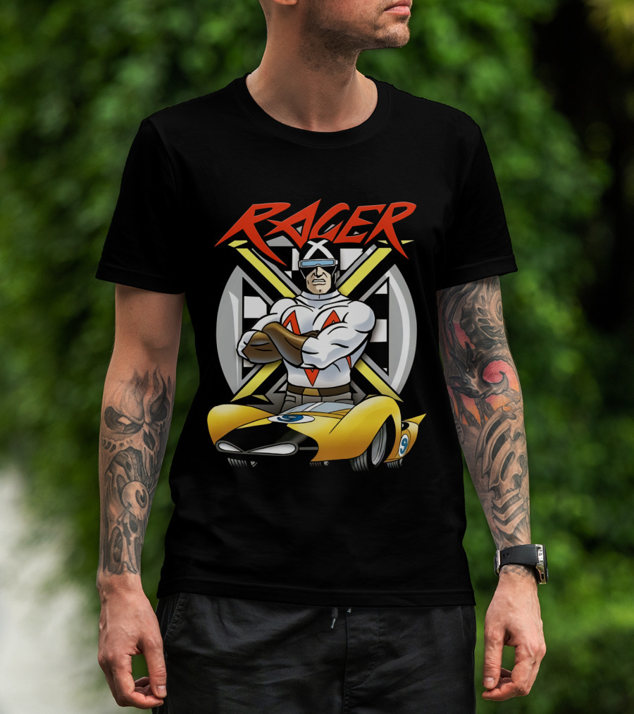Racer Speed Racer Character With Yellow Car And Checkered Flag Background T-Shirt