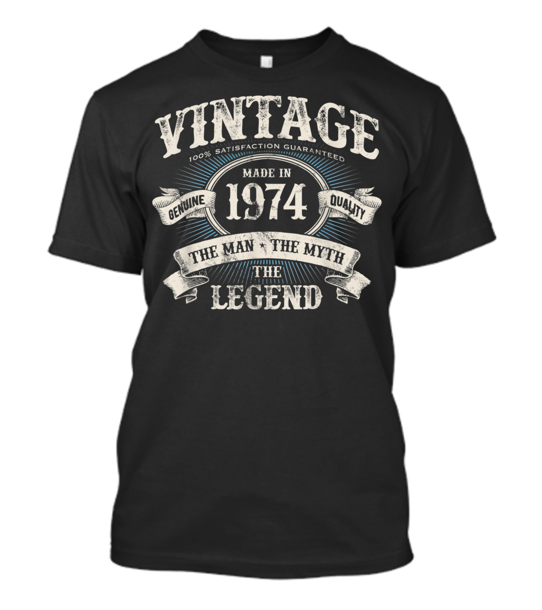 The Vintage Made In 1974 Genuine Quality The Man The Myth The Legend 100% Satisfaction Guaranteed T-shirt is designed for everyday wear and a consistent fit. Fabric is pre-shrunk ring-spun cotton with durable stitching. See the size chart below for exact measurements.