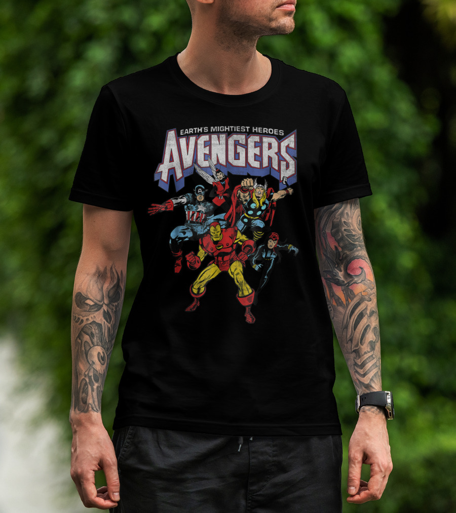 The Earth's Mightiest Heroes Avengers Classic Vintage Group Shot T-shirt is designed for everyday wear and a consistent fit. Fabric is pre-shrunk ring-spun cotton with durable stitching. See the size chart below for exact measurements.