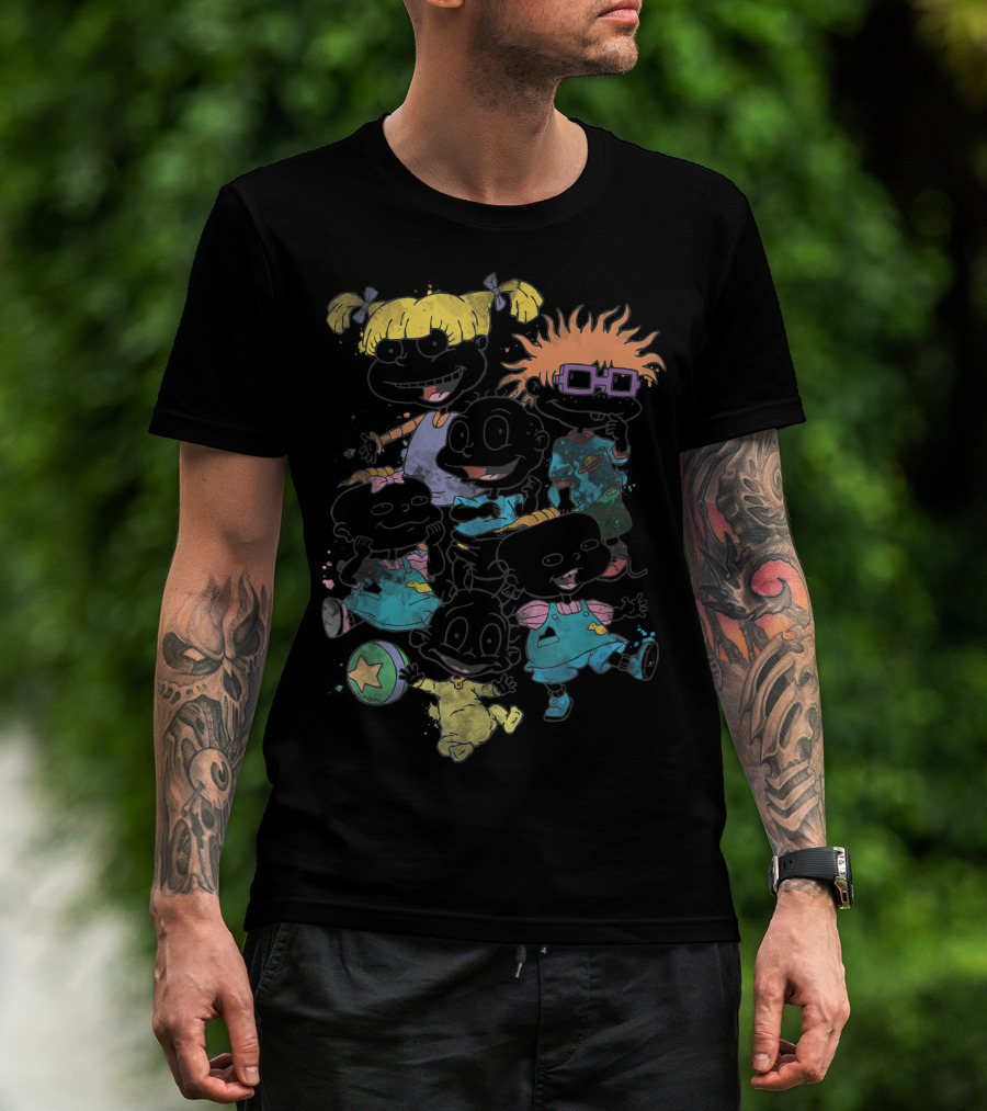 The Rugrats Baby Group Watercolor Characters with Bright Outfits and Playful Expressions T-shirt is designed for everyday wear and a consistent fit. Fabric is pre-shrunk ring-spun cotton with durable stitching. See the size chart below for exact measurements.