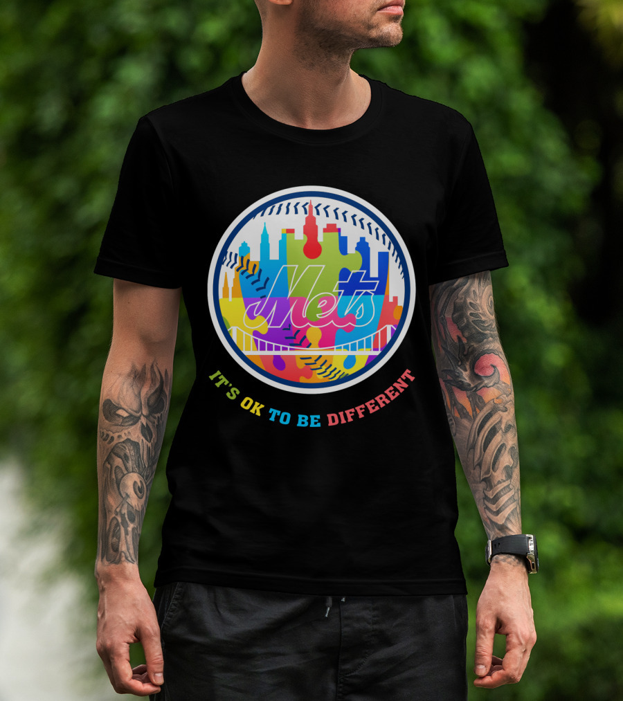 New York Mets It's OK To Be Different Colorful Skyline Bridge Puzzle Baseball T-Shirt