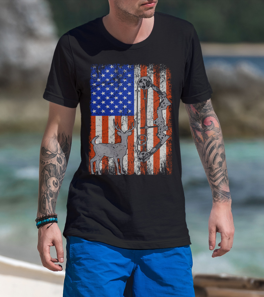 American Flag Deer Hunter With Bow Hunting Iconic T-Shirt