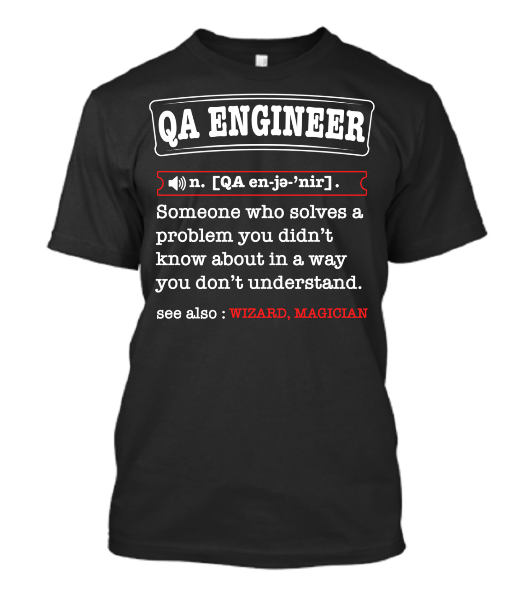 The QA Engineer Someone Who Solves a Problem You Didn’t Know About in a Way You Don’t Understand See Also Wizard Magician T-shirt is designed for everyday wear and a consistent fit. Fabric is pre-shrunk ring-spun cotton with durable stitching. See the size chart below for exact measurements.