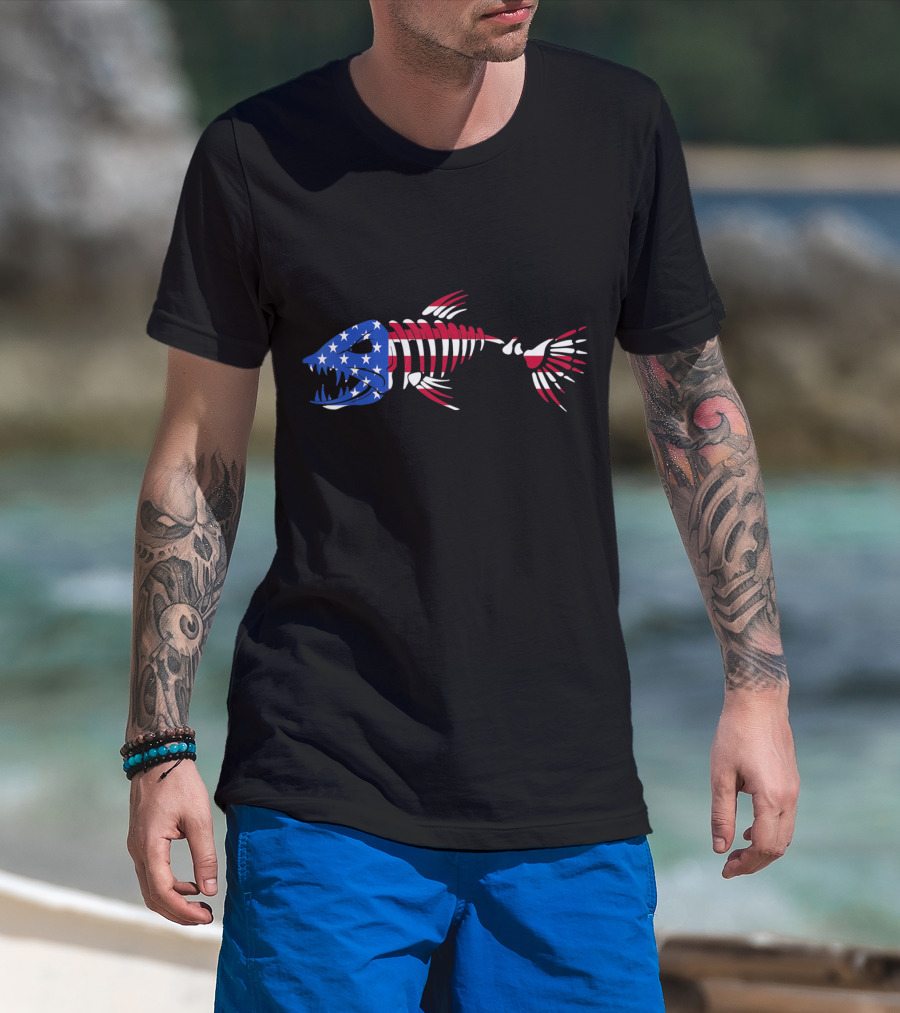 Patriotic Fish Skeleton With American Flag Colors T-Shirt