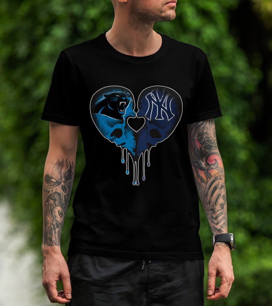 The Panthers Yankees Skull Heart Love T-shirt is designed for everyday wear and a consistent fit. Fabric is pre-shrunk ring-spun cotton with durable stitching. See the size chart below for exact measurements.
